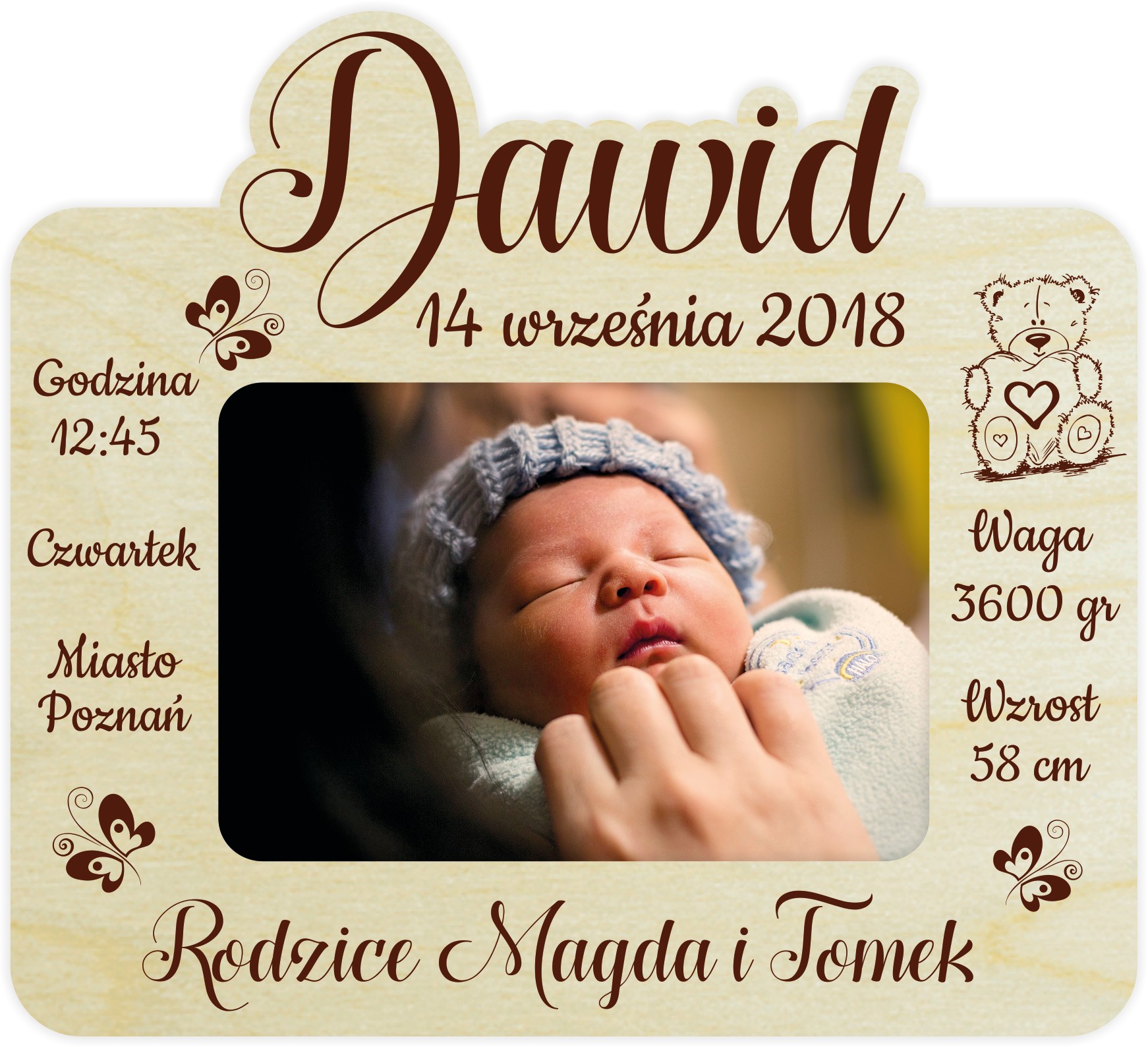 Jest możliwość dowolnej personalizacji ramki, zmiany tekstu na dowolny, usunięcia np. godziny urodzenia i zastąpienia czymś innym np. serduszkiem.