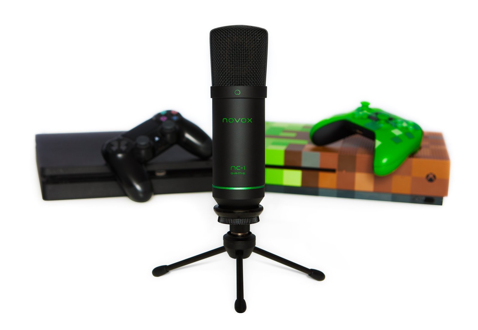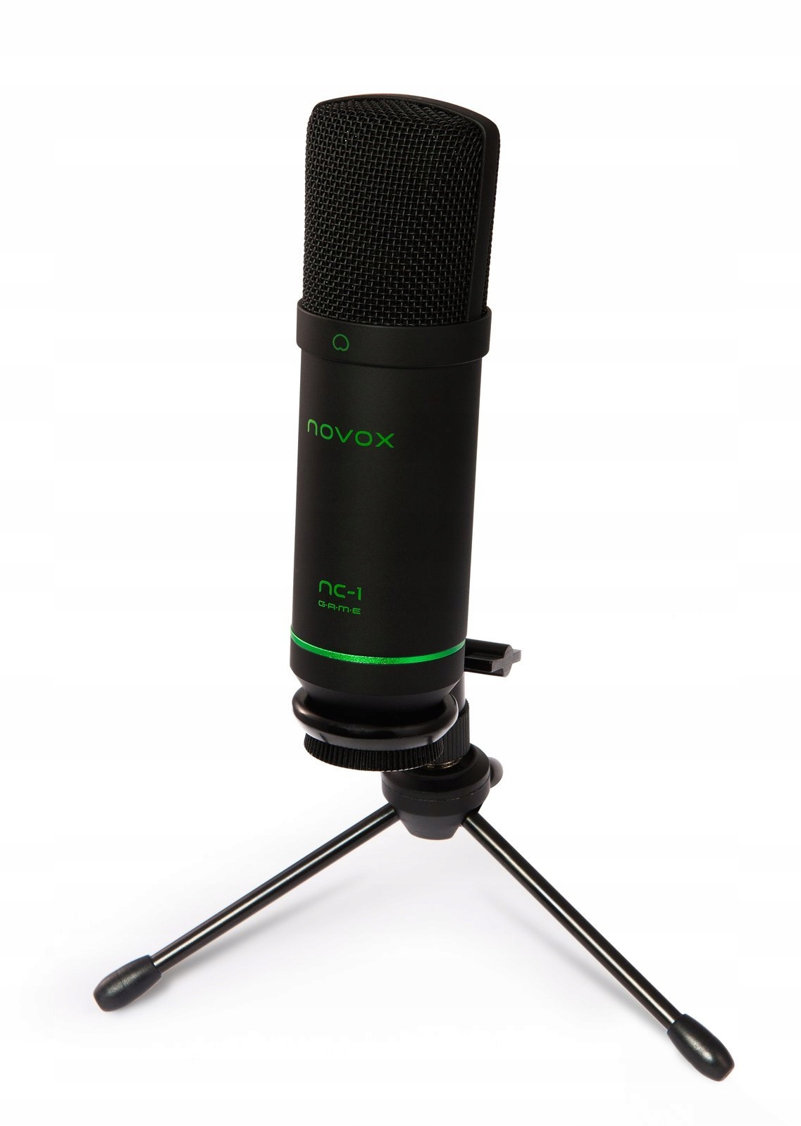 Novox NC-1 GAME jest wyposażony we wszystkie niezbędne akcesoria: uchwyt mikrofonowy, statyw biurkowy oraz kable USB i micro-USB.
