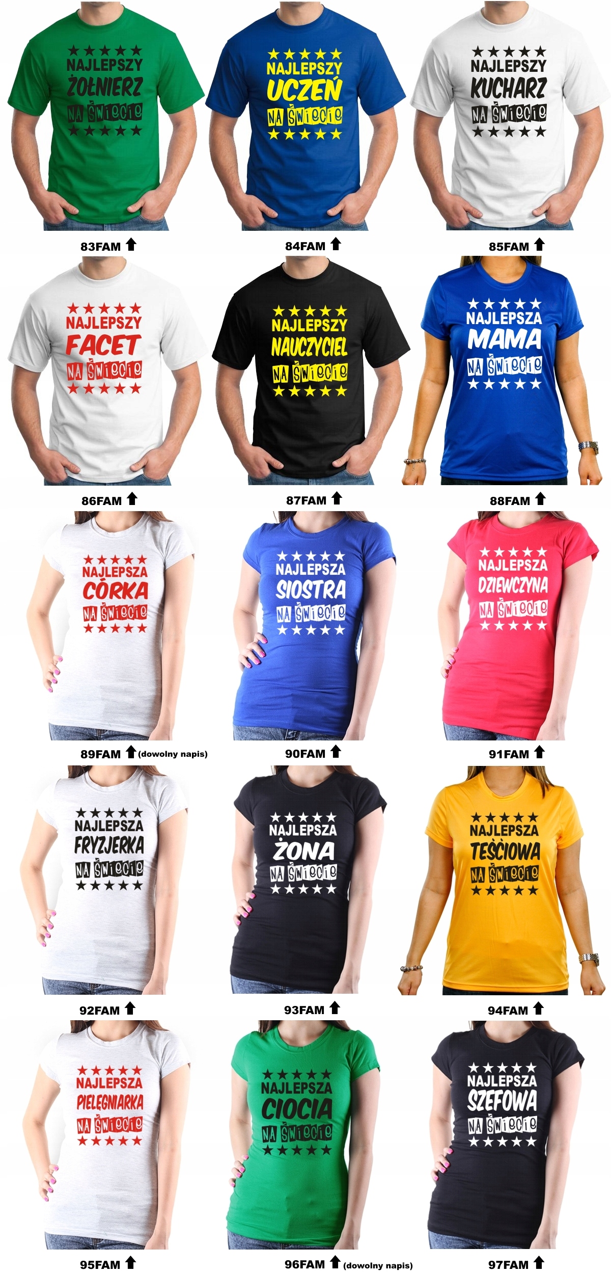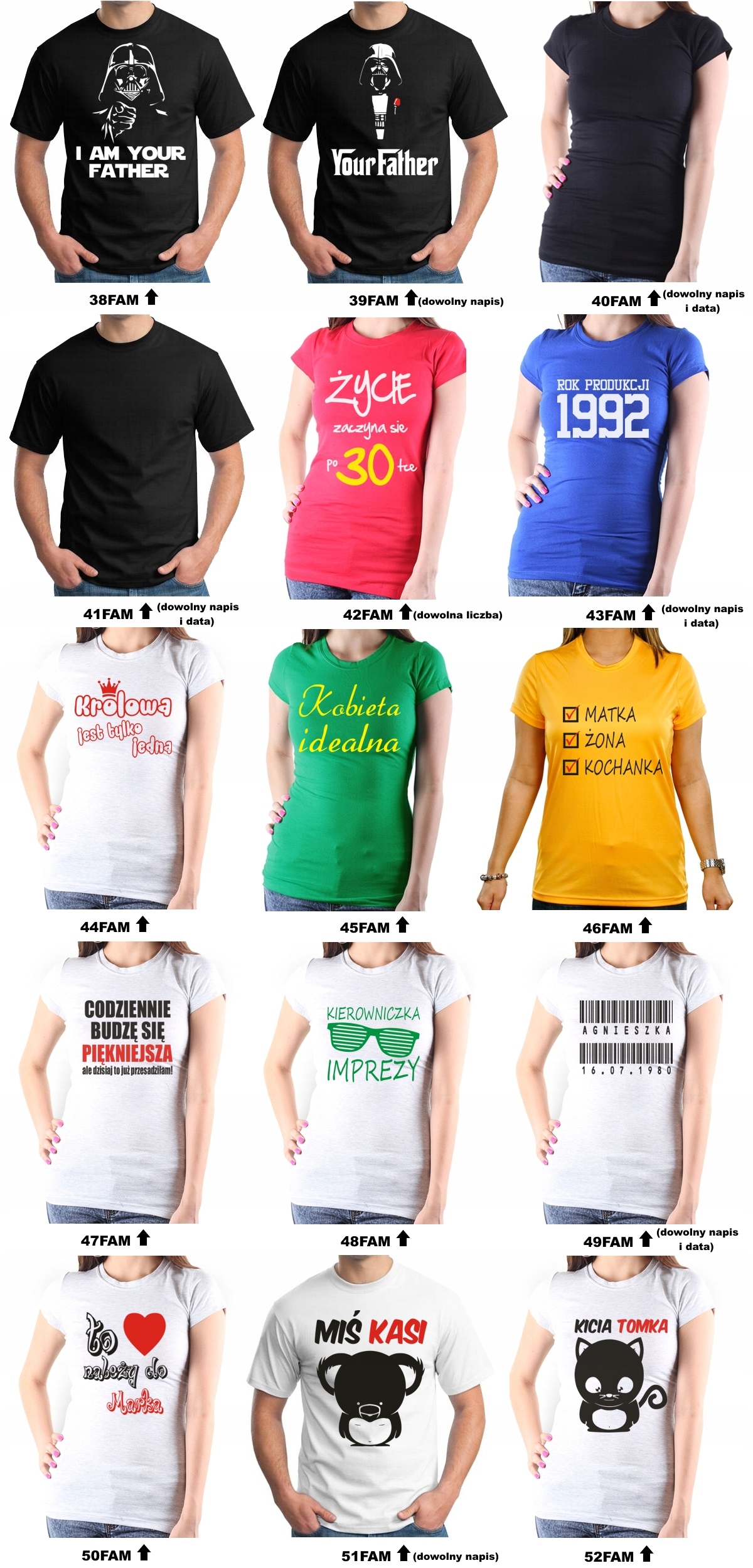 ROZMIAR L, DAMSKA, wzór-1FAM(numer wzoru pod koszulką lub nazwę wzoru z miniaturki), KOSZULKA CZARNA, NADRUK BIAŁY, (kolory do wyboru obok tabel z rozmiarami)