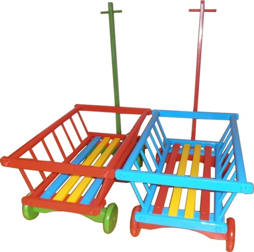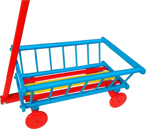 Візок зроблений міцно і акуратно з деревини бука, пофарбований кольоровими екологічними фарбами. Передня вісь візка торсіонна.