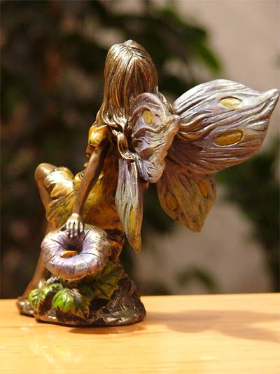 pełna uroku rzeźba elfa siedzącego na fiołku.