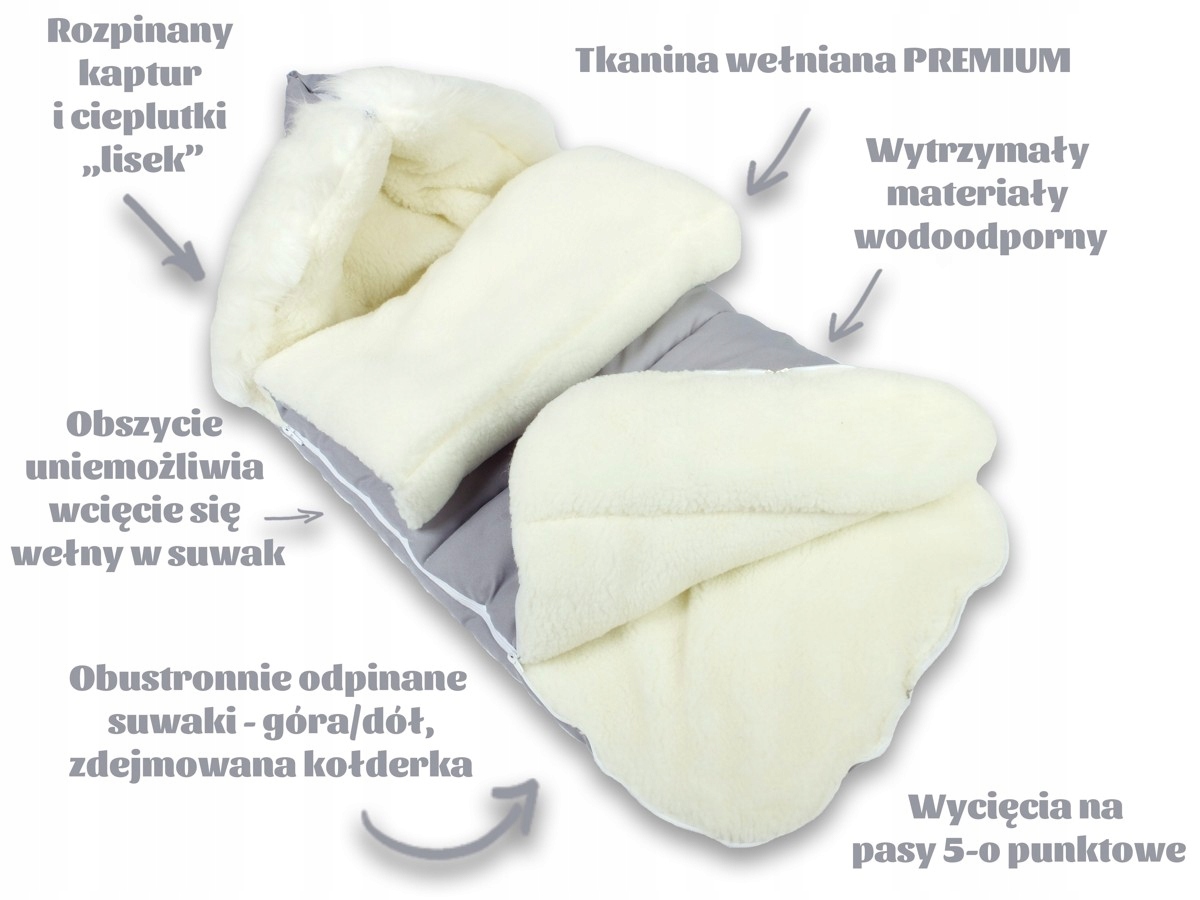 Śpiworek wykonany jest z najwyższej jakości dzianiny wełnianej w kolorze jasny krem. Jest ona niesamowicie przyjemna w dotyku i bardzo estetyczna. Z zewnątrz śpiworek obszyty jest wytrzymałym materiałem wodoodpornym. Puszyste wypełnienie przepuszczające powietrze i odprowadzające wilgoć zapewnia doskonały komfort. Taka kombinacja sprawdzi się w każdych warunkach.