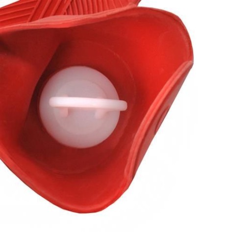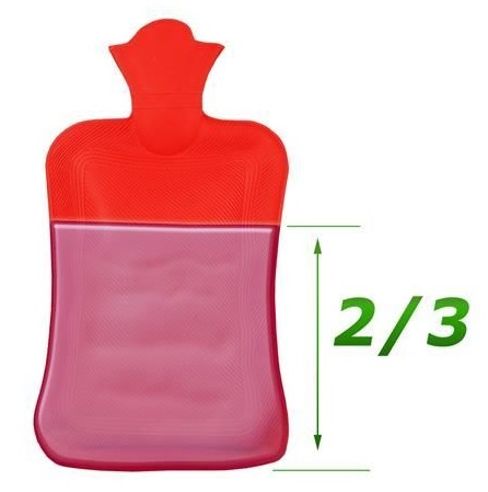 - Тримайте гумову горловину грілки у вертикальному положенні та наповніть грілку водою наполовину або на 2/3.