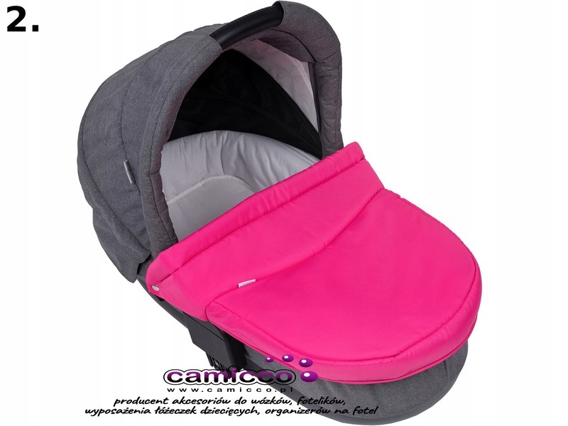 Uniwersalny pokrowiec wykonany jest z impregnowanego materiału wykorzystywanego do produkcji wózków dziecięcych, w środku wypełniony pianką która nadaje sztywność, dzięki niej pokrowiec idealnie dopasowuje się do każdej gondoli, spód wykończony czarną podszewką