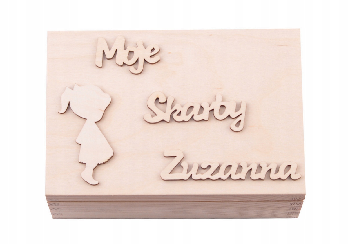 Na wieczku wycinany napis i oryginalne dekory - również naturalnym kolorze - ,,Moje Skarby Zuzanna'