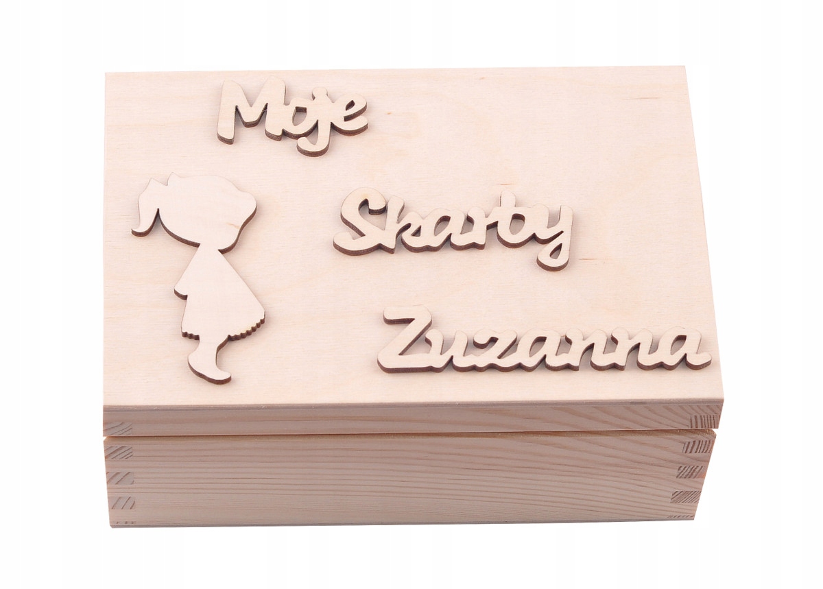 EKO DREWNIANA SKRZYNKA NATURALNY KOLOR Z NAPISEM - ,,Moje Skarby Zuzanna''
