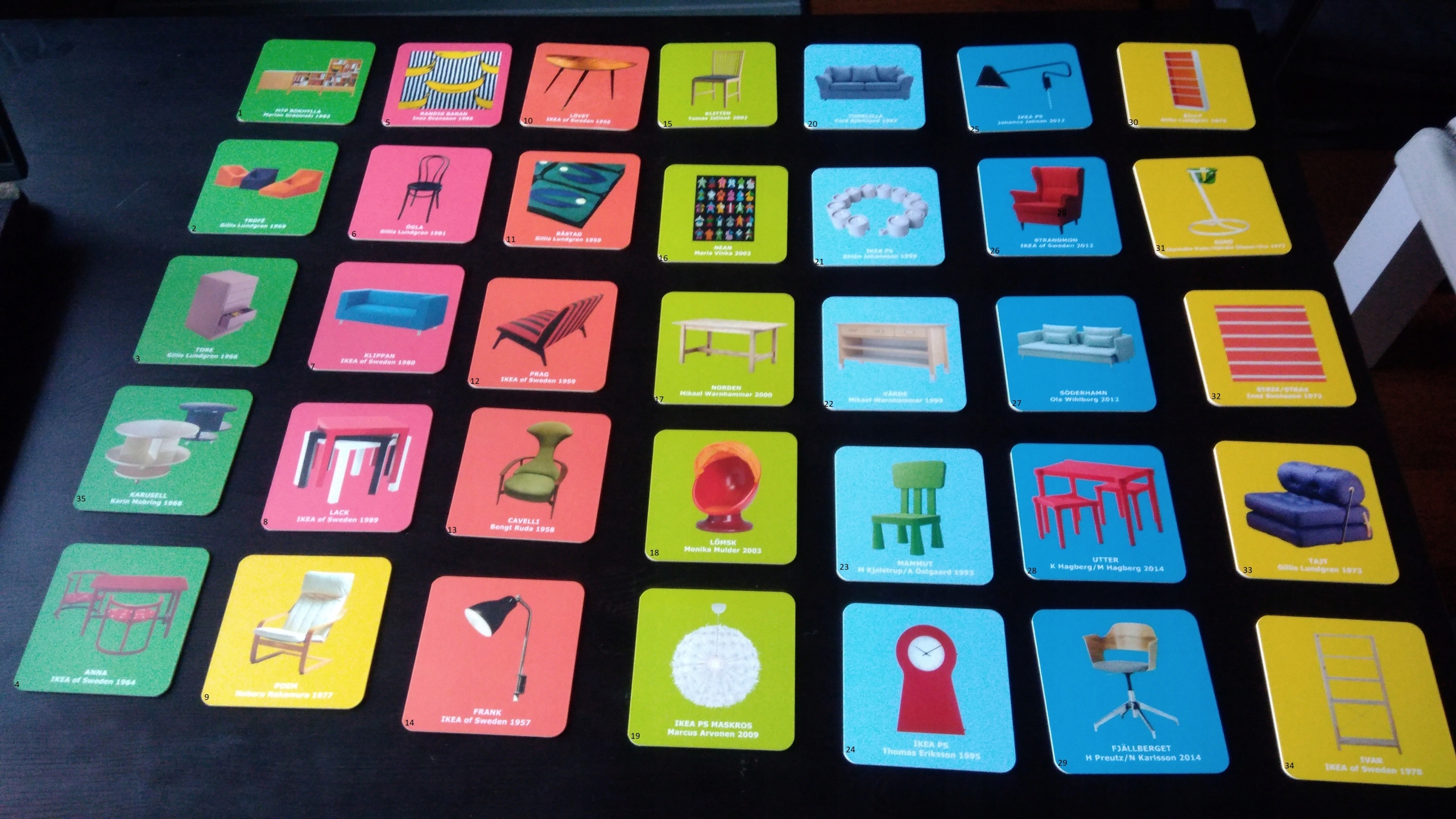 Podkładki mają inny wzór po każdej stronie. Z jednej strony kultowe produkty ikea, z drugiej geometryczne wzory.