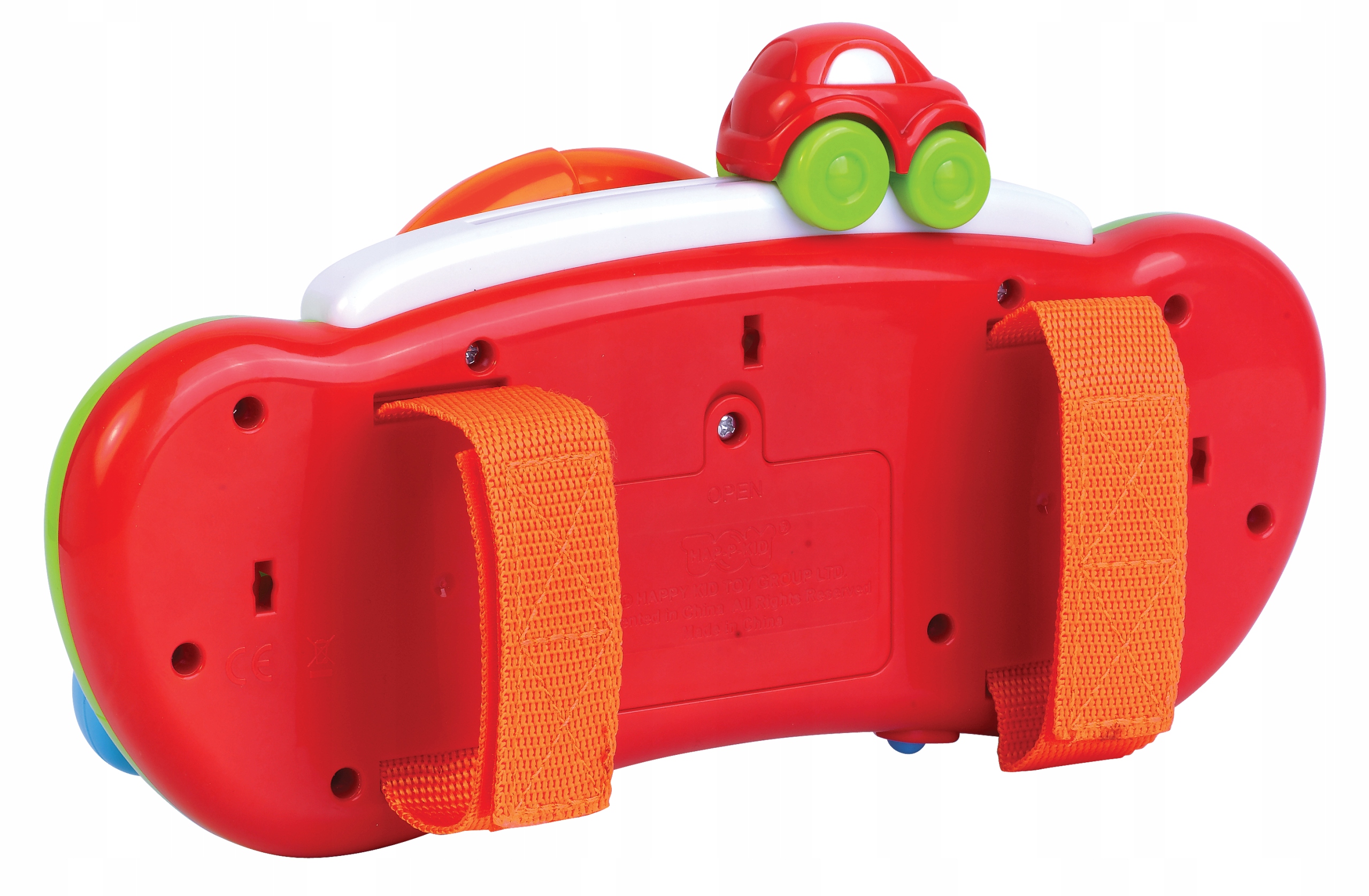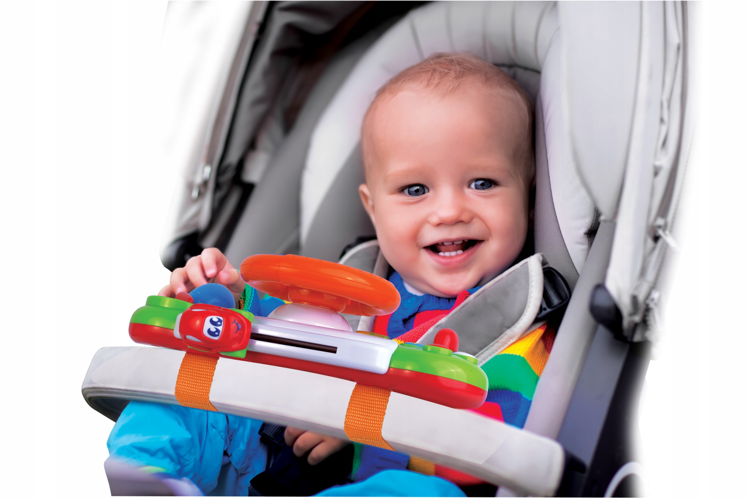 - Na kierownicy maluch znajdzie 3 dodatkowe przyciski ze zwierzątkami -po ich naciśnięciu dziecko usłyszy odgłosy zwierzątek i wesołe melodyjki zachęcające do zabawy.