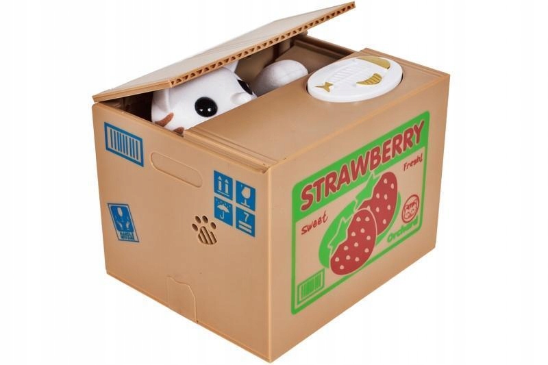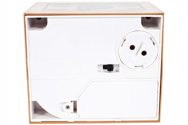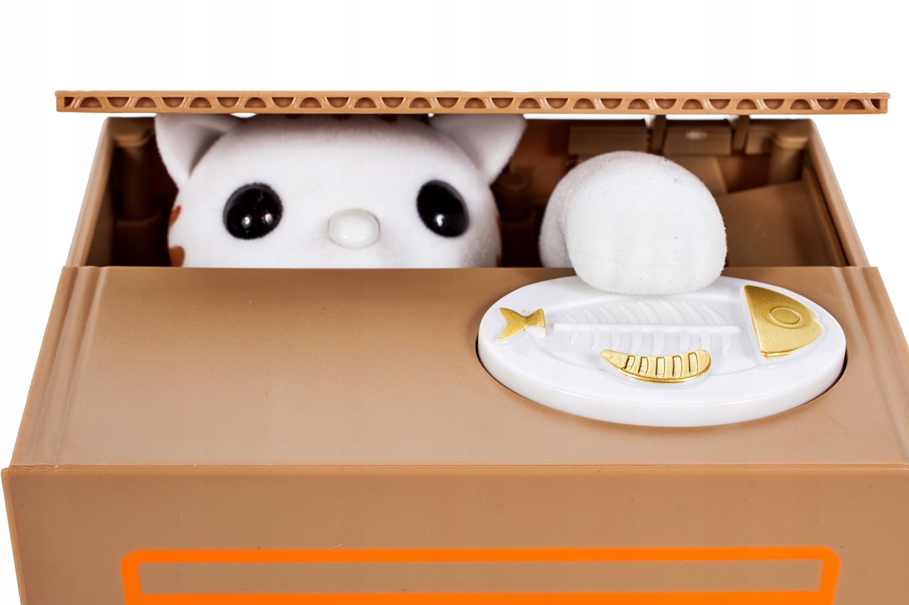 Jak to działa? Układamy monetę na talerzyku, który znajduje się na brzegu skarbonki, wówczas pod wpływem nacisku wyłania się z pudełka zwierzątko, które łapką zgarnia monetę. Zwierzątko chowająca się w pudełeczku zagarnia łapką pieniążki leżące na jego krawędzi przy czym wydaje dźwięki oraz się porusza.