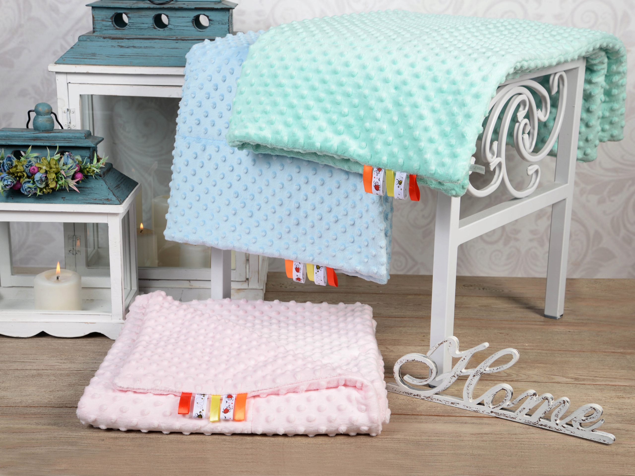 Dwustronny kocyk minky o wymiarach 80 x 80 cm (+/- 2 cm ) wykonany z mięciutkiej tkaniny – polaru - MINKY (360 gr/m2). W środku kocyka znajduje się wypełnienie z lekkiej włókniny (tzw. ocieplacz) o gramaturze 80gr/m2.