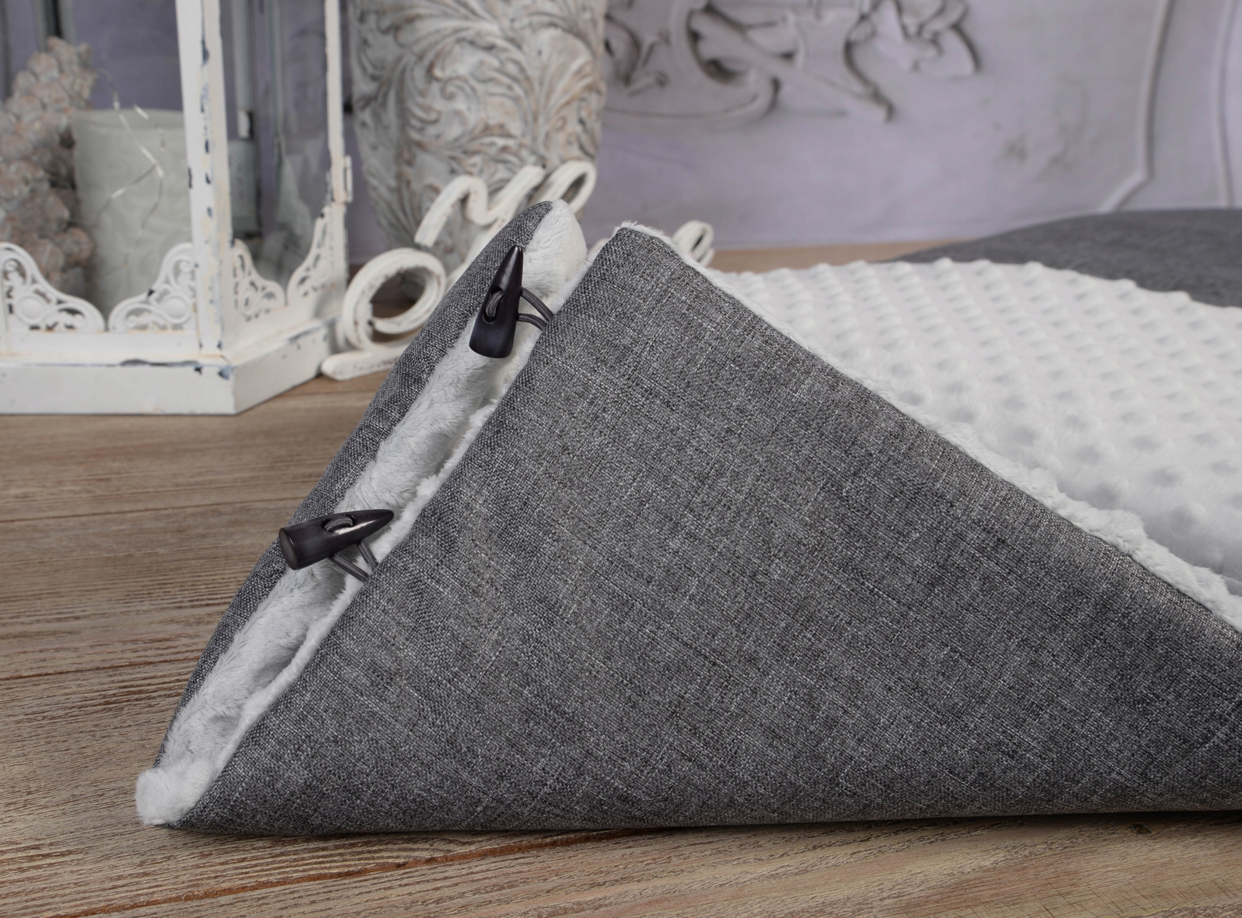 Na zewnątrz zastosowano najwyższej jakości tkaninę nieprzemakalną i wytrzymałą na wszelkie warunki pogodowe, natomiast w środku znajduje się mięciutki i ciepły polar minky. Pomiędzy tkaninami użyto włókniny antyalergicznej o grubości 200 gr/m2