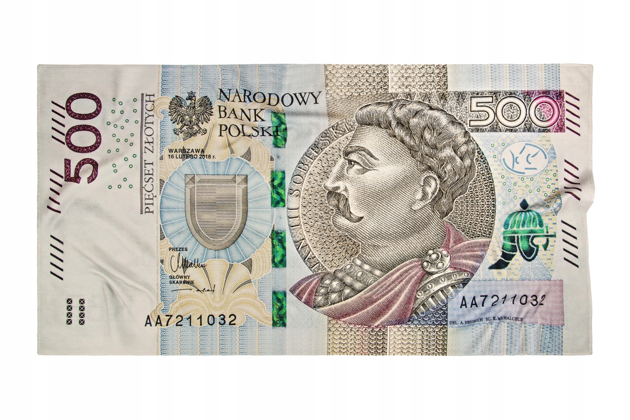 Duży ręcznik przedstawiający reprodukcję banknotu 500 złotowego z wizerunkiem króla Jana III Sobieskiego