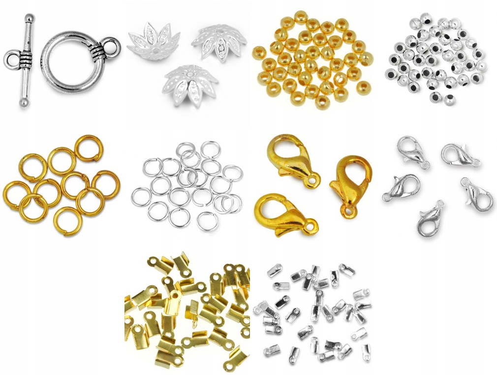 Wyszczególnienie: Zapięcie bransoletki - 1szt, Nakładka ozdobna 10mm - 4szt, Kulki pozłacane 3mm - 50szt, Kulki przekładki 3mm - 50szt, Kółeczka montażowe 6mm - 20szt, Kółeczka montażowe 6mm - 20szt, Karabinczyki złote 10mm - 3szt, Karabińczyki 10mm - 3szt, Zaciski końcówki 6mm - 10szt, Zaciski do sznurków 6mm - 10szt,