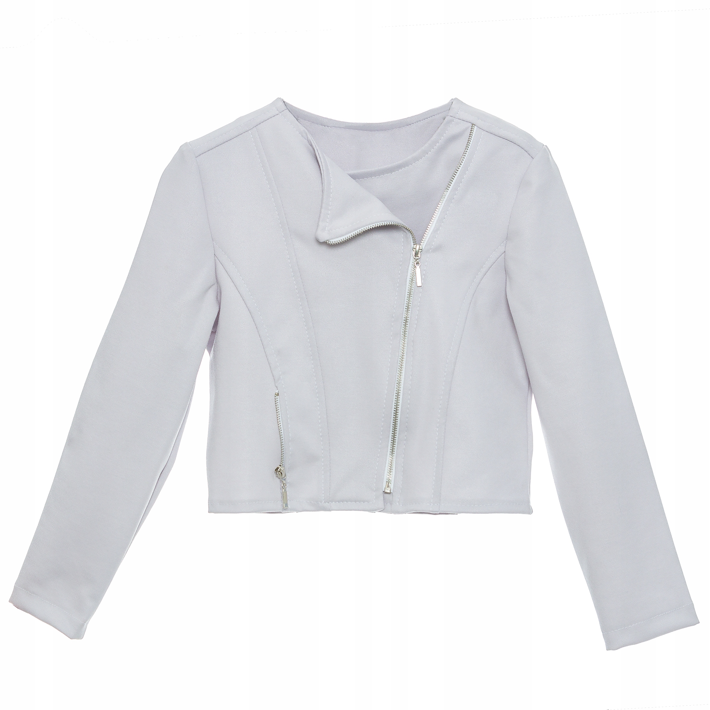 Wykonany jest z naciągającej się tkaniny z lekkim połyskiem imitującej skórę. Zapinany na asymetryczny metalowy zamek w kolorze srebrnym. Z boku ozdobny zamek imitujący kieszonkę. Żakiet ładnie dopasowuje się do sylwetki ponieważ posiada taliowany modny krój. Pasuje do każdej sukienki, spódniczki, spodni.