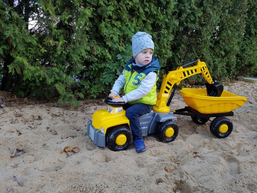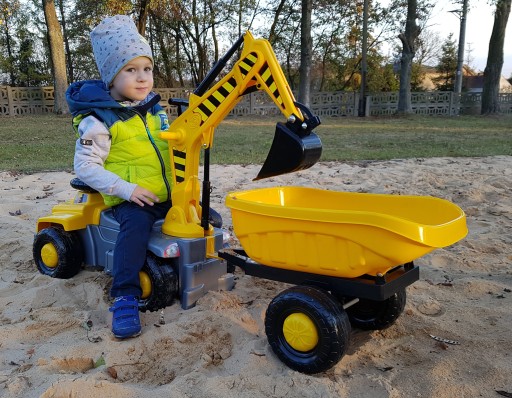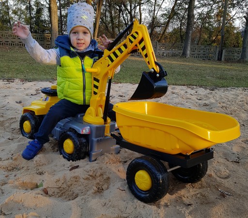 Іграшка подвійного призначення - як катання, дитина піднімає руку екскаватора вгору, повертає руку до задньої частини катання, а потім сідає на сидіння обличчям до керма. Залежно від напрямку штовхання ногами, він йде вперед або назад - як екскаватор - дитина піднімає руку екскаватора вгору, повертає руку до спини вершника, а потім сідає на сидіння спиною до керма. колесо. За допомогою рук дитина інтуїтивно керує рухомим важелем і ковшем екскаватора. У задній частині іграшки є гачок, який дозволяє буксирувати, кріпити причіп або інший транспортний засіб