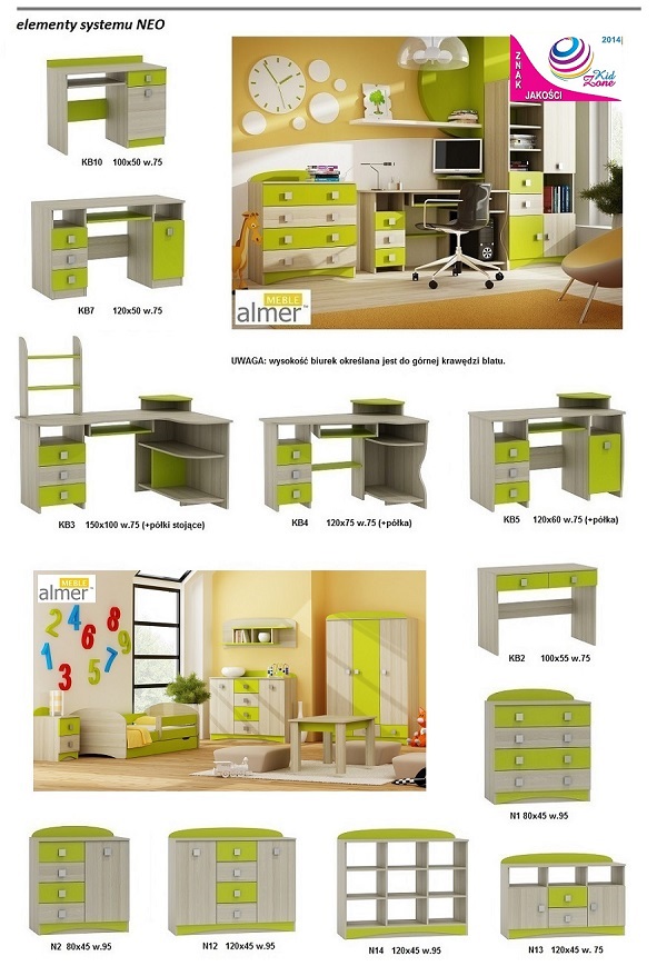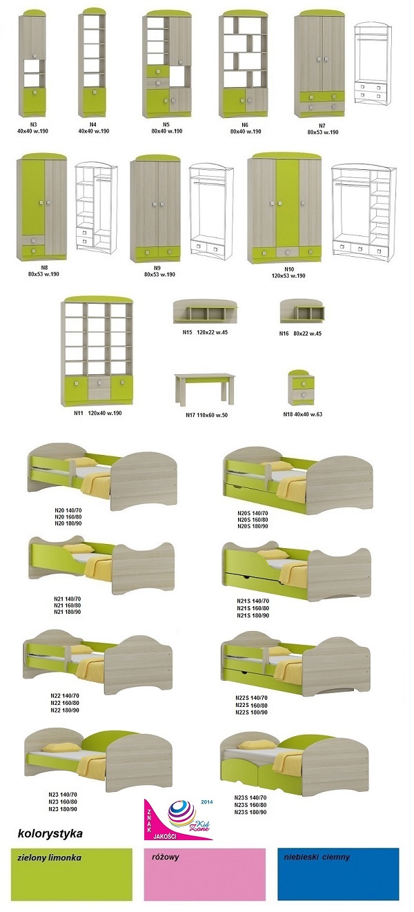 Meble w pokoju dziecinnym powinny zapewniać kompleksowe wykorzystanie ograniczonej przestrzenie stanowiąc jednocześnie niepowtarzalny element dekoracyjny pokoju. Wszystkie nasze produktu wykonywane są w oparciu o płyty laminowane oraz MDF najwyższej klasie higienicznej E1 pochodzące z fabryk KASTAMONU oraz KRONOSPAN. W produktach są wykorzystywane również atestowane obrzeża ABS i PCV, zawiasy, prowadnice szuflad oraz uchwyty specjalnie zaprojektowane dla dzieci przez austriacką firmę SIRO.