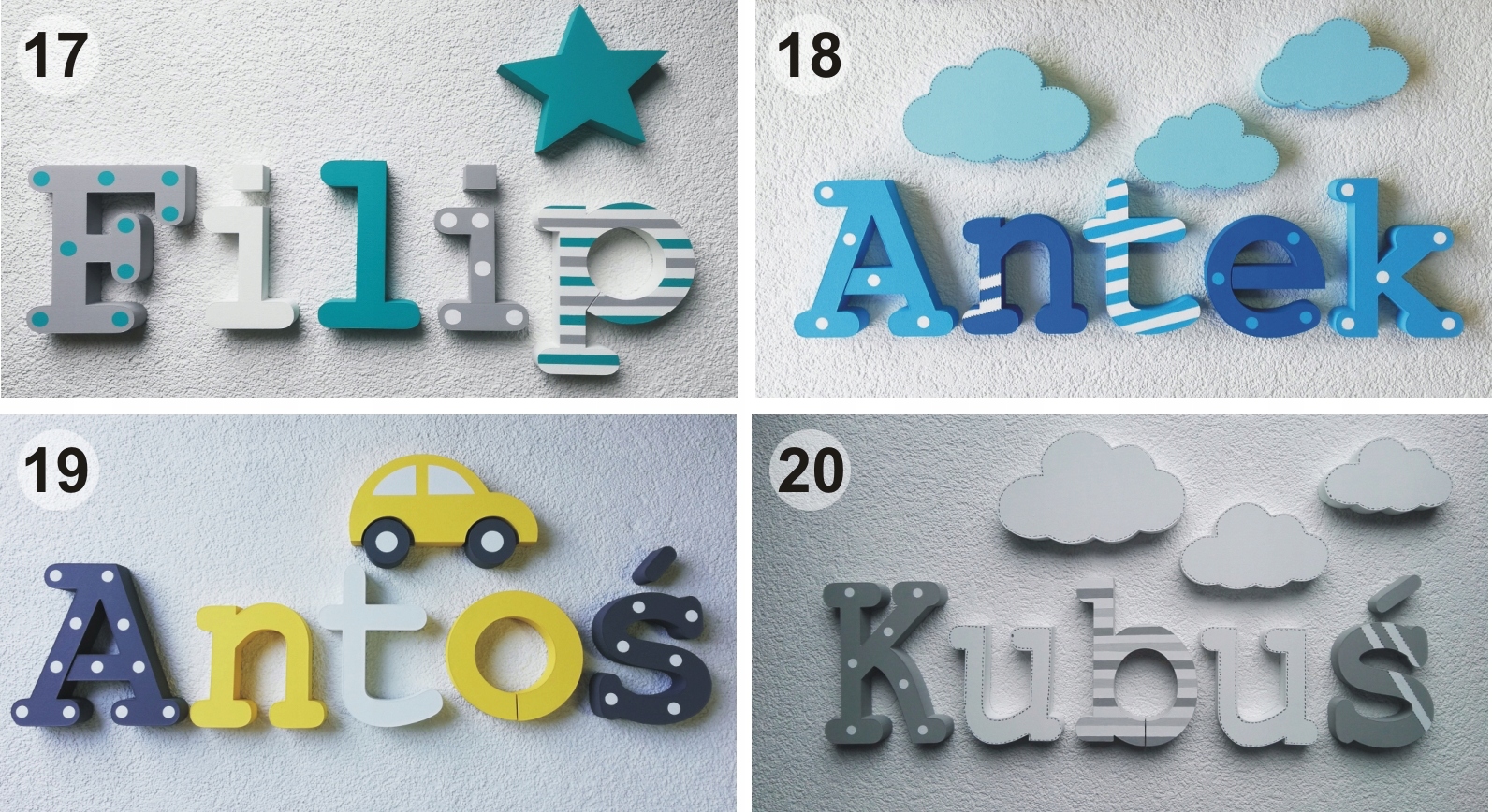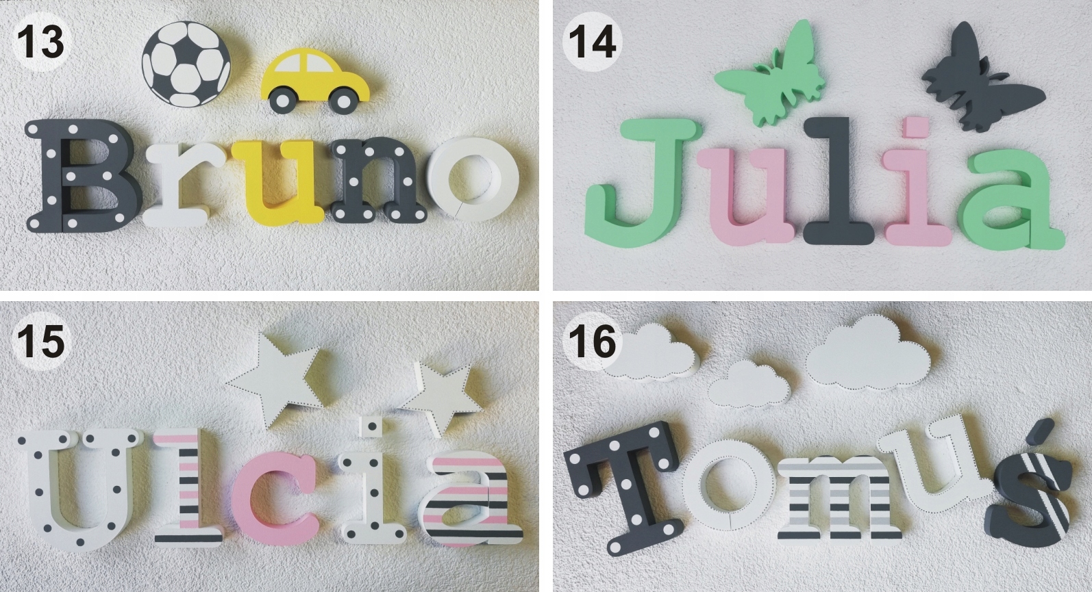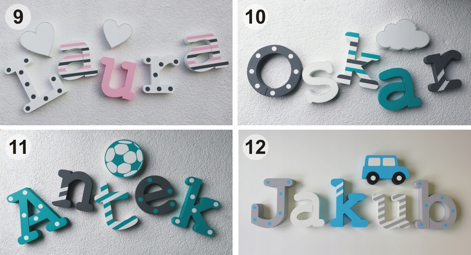 Kolorowe literki wykonane są z lekkiego styroduru o grubości około 2,5cm. Wysokość największej literki to około 17cm reszta literek proporcjonalnie według wzoru. Literki malowane są ręcznie farbami akrylowymi, zdobione różnymi motywami co daje super efekt końcowy. Doskonale nadają się jako oryginalna i efektowna ozdoba każdego wnętrza jak i idealny prezent dla pociechy i rodziców. Literki można przykleić do ściany za pomocą taśmy dwustronnej piankowej lub kleju montażowego do styropianu np. Fixall