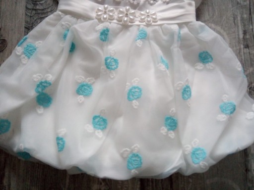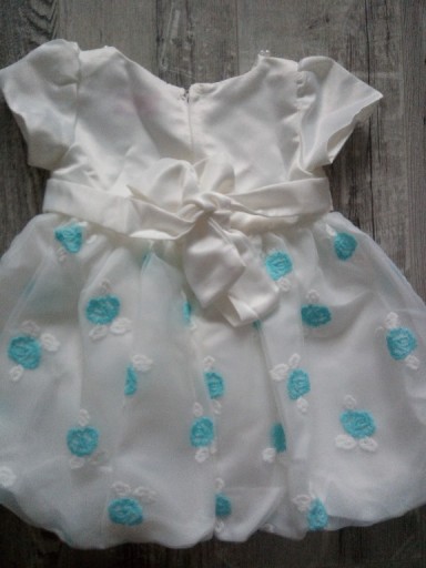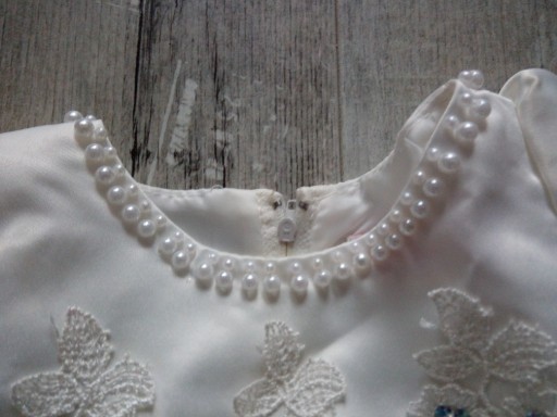 Сукня була одягнена лише один раз на церемонію в церкві, після чого відразу знята.Фенечка, крій, численні аксесуари на підкладці у вигляді блискучих елементів, перлів і вшитих бірюзових квітів, блискавка внизу, на ззаду і підв'язується гарним поясом. Ідеальний стан. Колір: екрю/білий. Немає. Я не можу сказати вам розмір на етикетці, тому дайте мені мірки для пояса: довжина від плеча 42-43 см, талія 25 -26см, ширина від рукава до рукава 20см