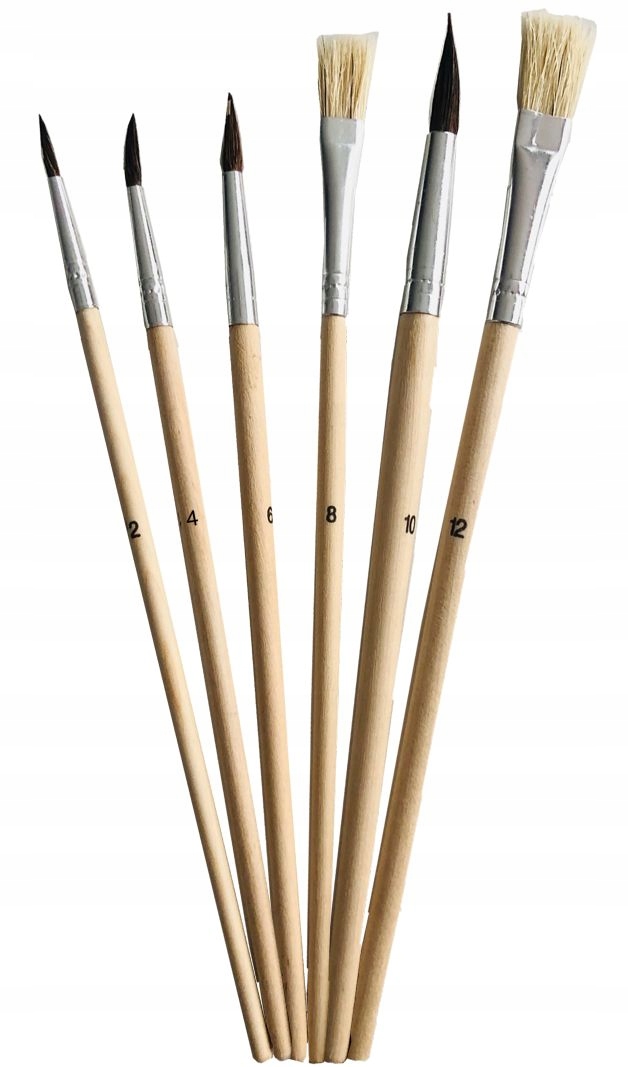 Praktyczny i uniwersalny zestaw 6 pędzelków szkolnych różnej grubości w rozmiarach: 2, 4, 6, 8, 10 i 12. Pędzelki idealnie rozprowadzają zarówno farby akwarelowe jak i plakatowe, ale można je też stosować do aplikacji kleju.