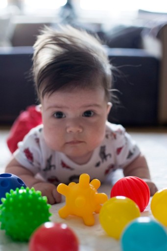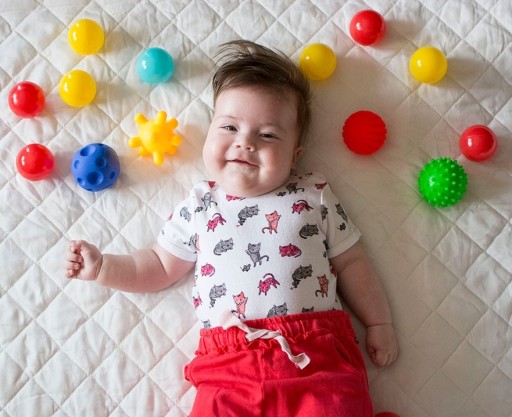 Даючи дитині грати з м’ячем, ви змушуєте її розвивати м’язи рук і вчитися використовувати пальці, таким чином покращуючи координацію між свідомим захопленням і баченням.