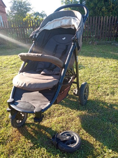 У коляски пошкоджено кріплення одного переднього колеса (потрібно жорстке кріплення або заміна на нове, деталь можна купити в інтернеті)