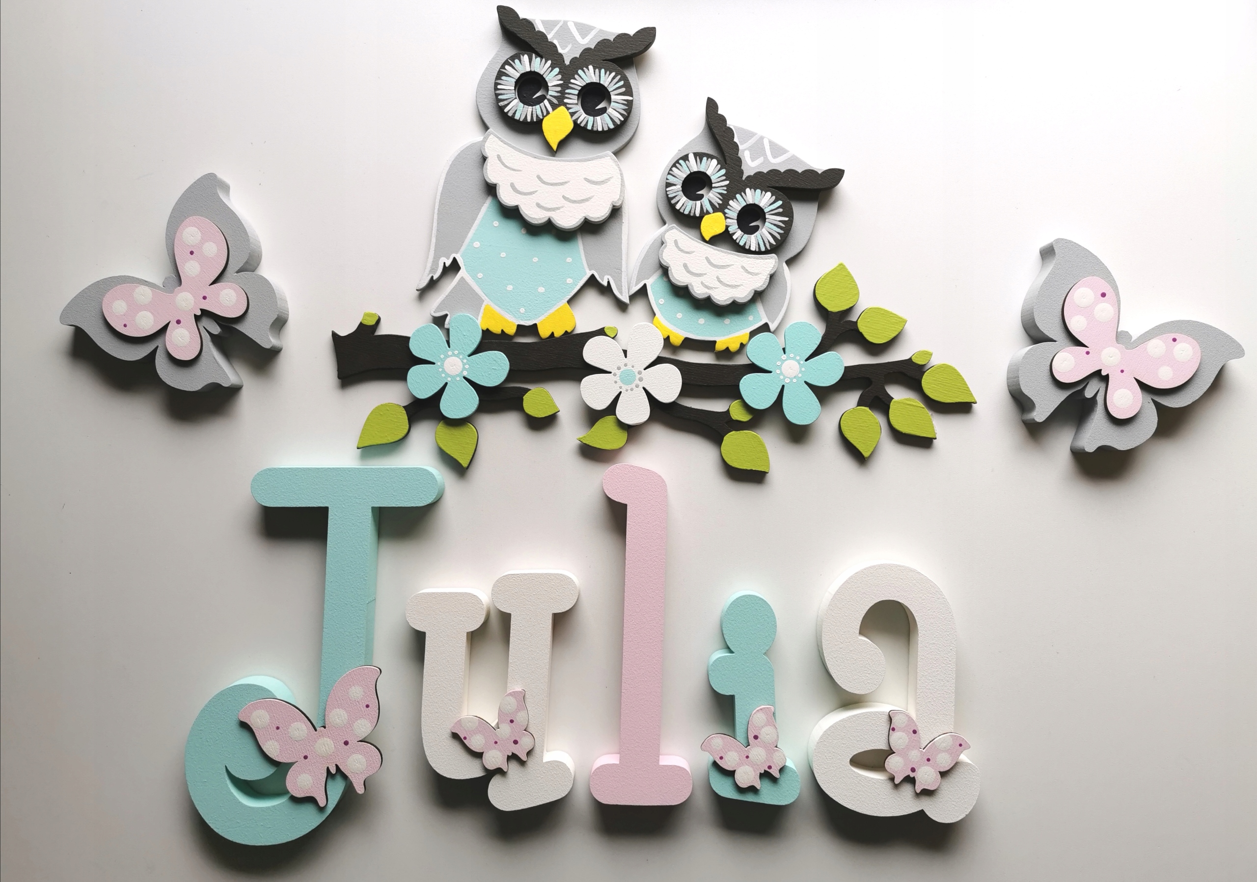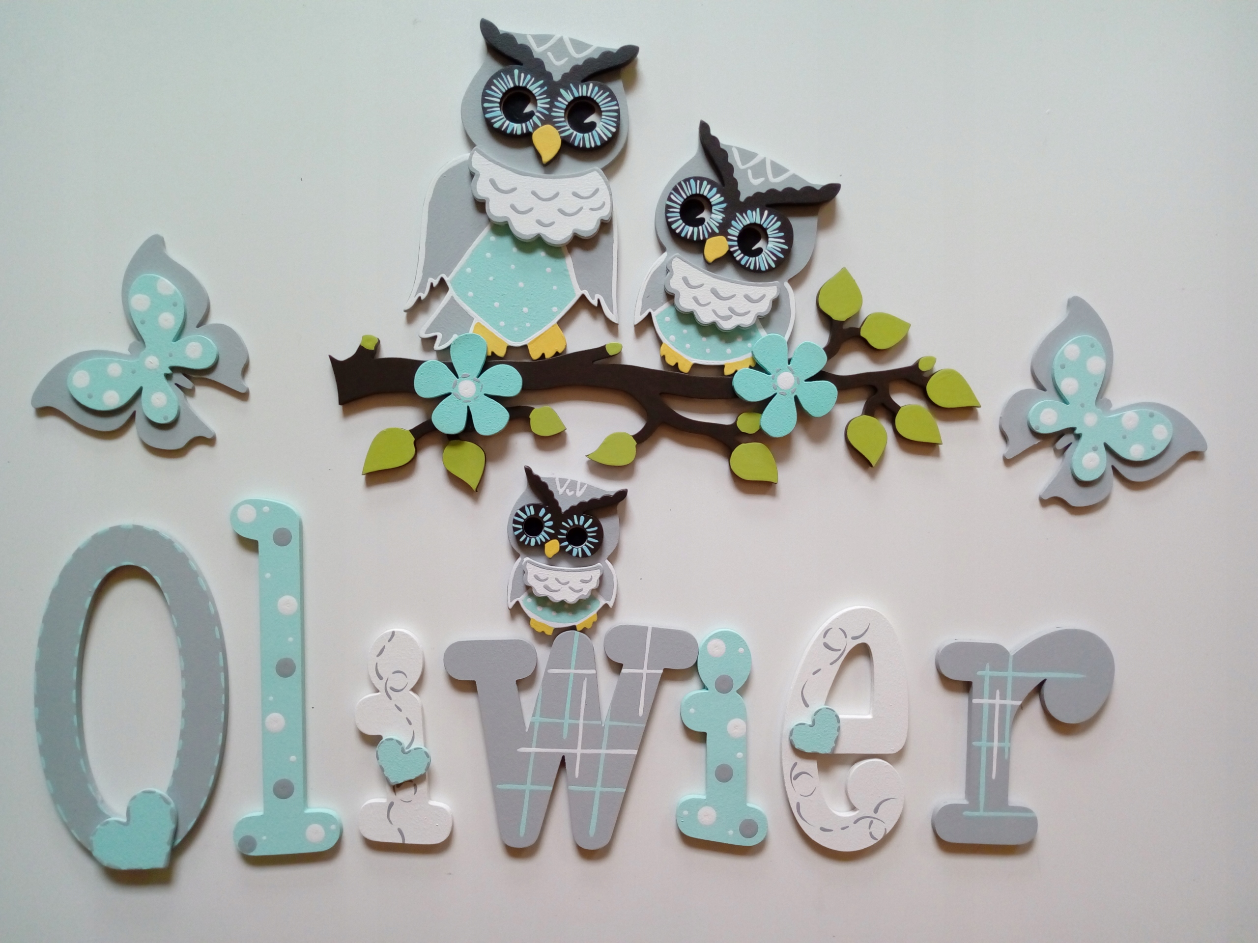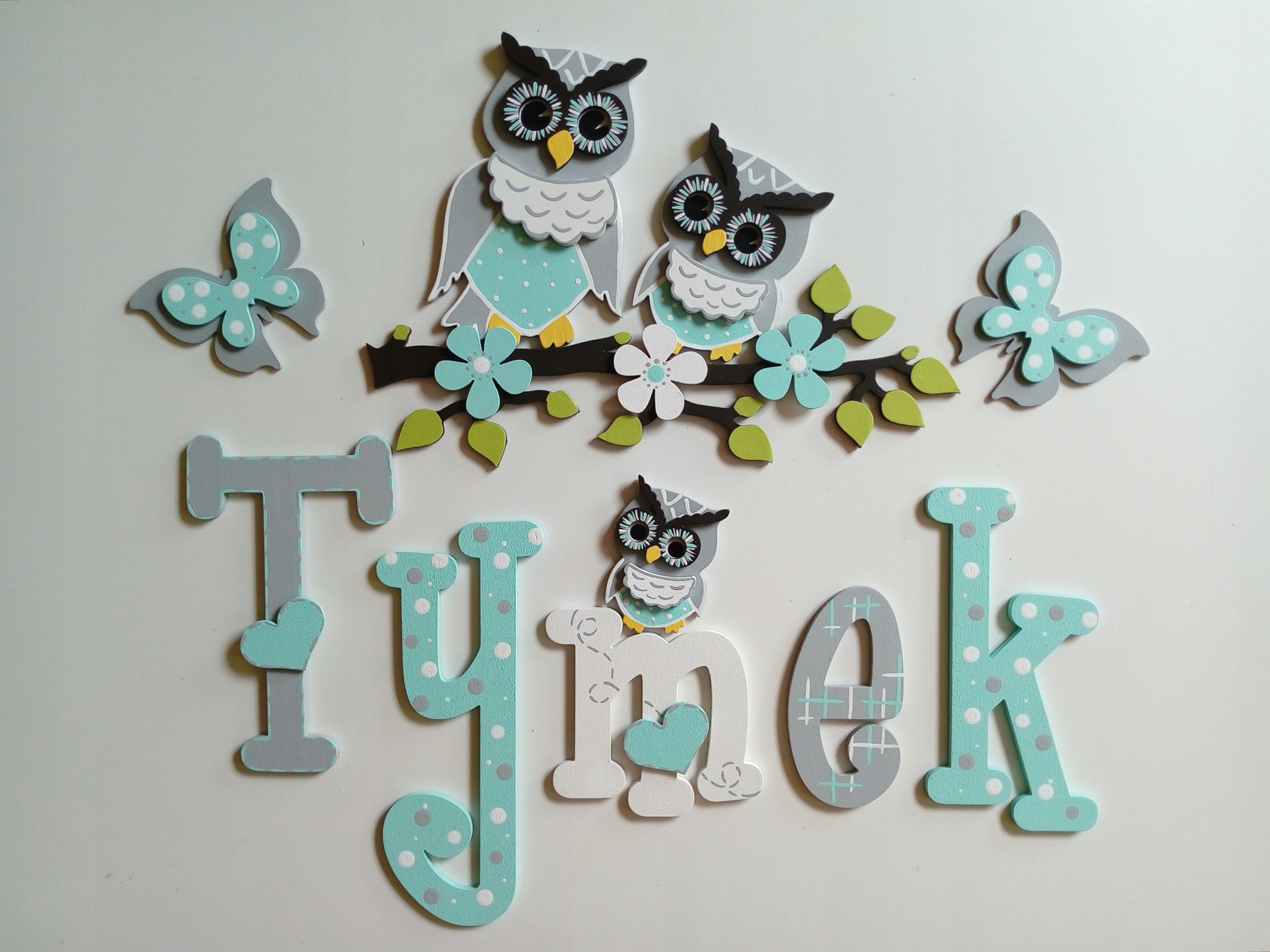 20P Drewniane literki+ sowy siedzące na gałązce !