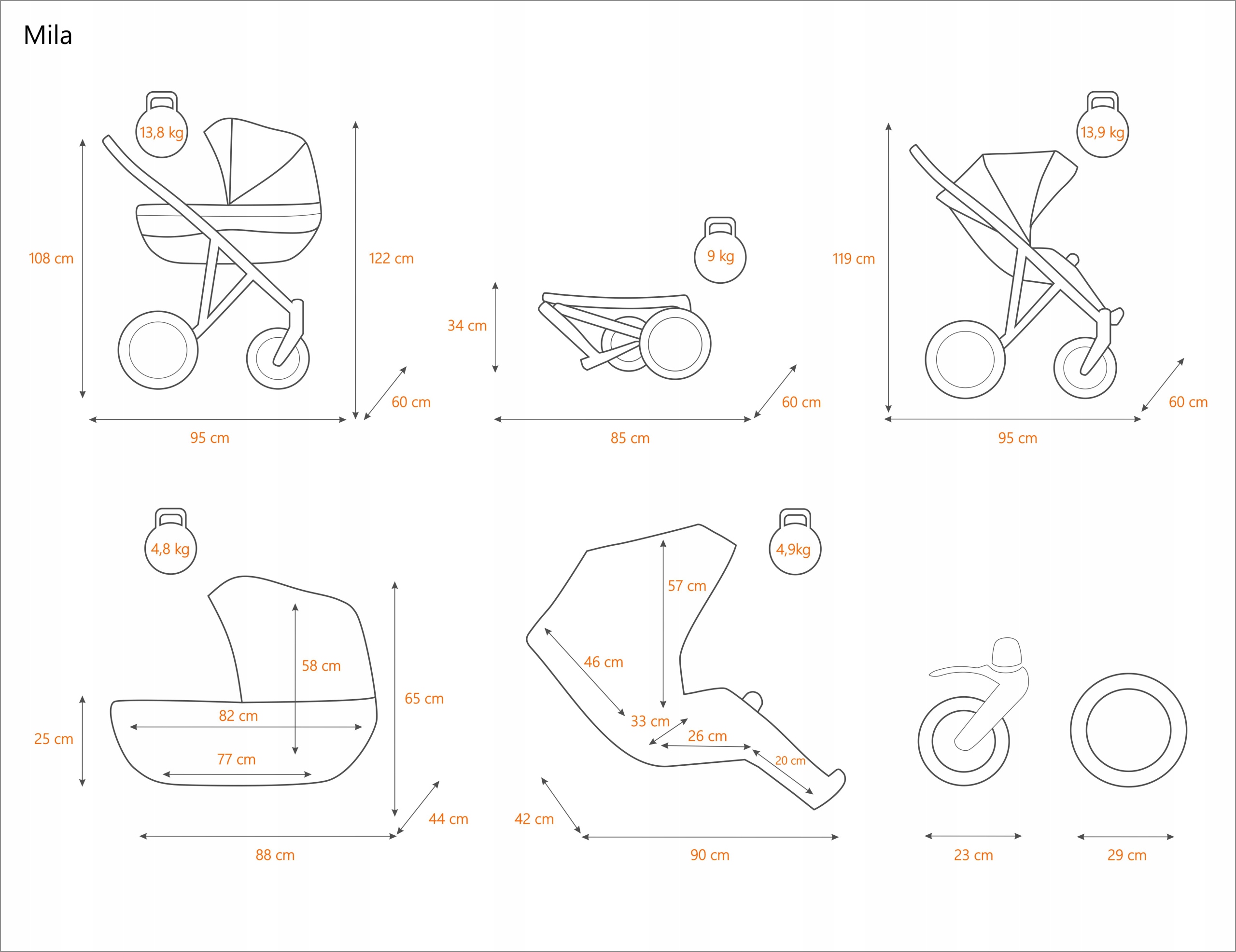 dopasowany pokrowiec chroniący przed niekorzystnymi warunkami atmosferycznymi rączka obszyta EKO skórą w budce umożliwiająca przenoszenie gondoli z dzieckiem folia przeciwdeszczowa materacyk i delikatne wyścielenie gondoli płynna regulacja oparcia pod główkę dla dziecka duża i wygodna gondolka wymiary wentylacja