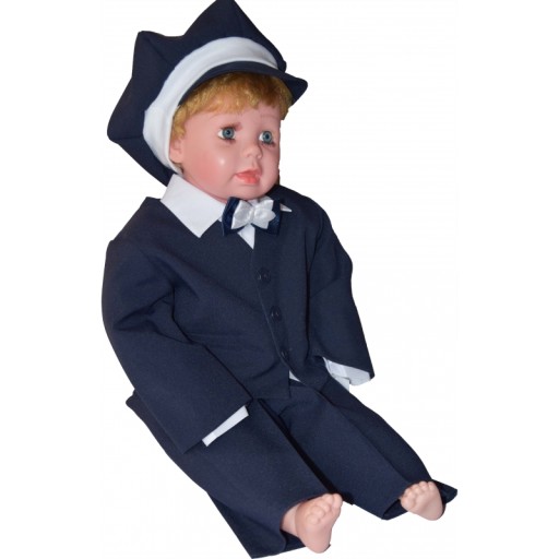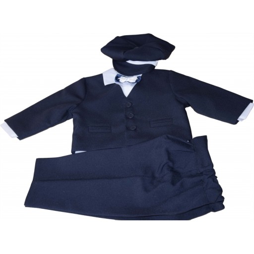Темно-синій костюм, в комплекті біла сорочка, краватка-метелик і кепка. Піджак на підкладці застібається на три ґудзики, сорочка застібається на чотири ґудзики, штанці запрасовані в складку - еластичний пояс Шапка оброблена трикотажем - рантом, завдяки чому не здавлює голову дитини. Краватка-метелик на зав'язаній гумці Бавовняна тканина. ПОЛЬСЬКИЙ ПРОДУКТ!