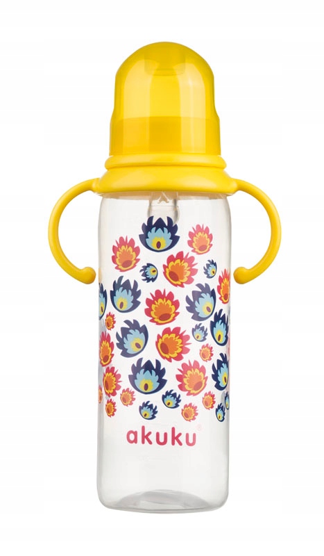 Butelka tradycyjna, wąskootworowa z wygodnymi, odpowiednio wyprofilowanymi uchwytami, ułatwiającymi trzymanie butelki w malutkich rączkach dziecka. Lekka i poręczna, wykonana z bezpiecznego tworzywa – polipropylenu. Wyposażona w silikonowy smoczek antykolkowy okrągły o wolnym przepływie. Szczelny kolorowy kapsel zapobiega rozlaniu zawartości podczas transportu i zabezpiecza smoczek przed zabrudzeniem, a plastikowy dysk uszczelniający przekształca butelkę w pojemnik do przechowywania/zamrażania pokarmu. Wytłoczona podziałka pozwala dokładnie odmierzyć porcję pokarmu. Butelka ozdobiona jest ciekawymi nadrukami. Dostępna w kilku wersjach kolorystycznych: żółty, niebieski, zielony i czerwony.