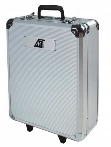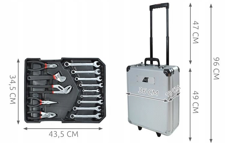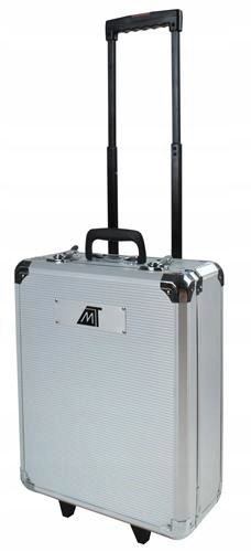 Zestaw narzędzi w metalowej walizce zamykanej na kluczyk. Wbudowane kółeczka ułatwiające przesuwanie walizki oraz teleskopowa rączka.