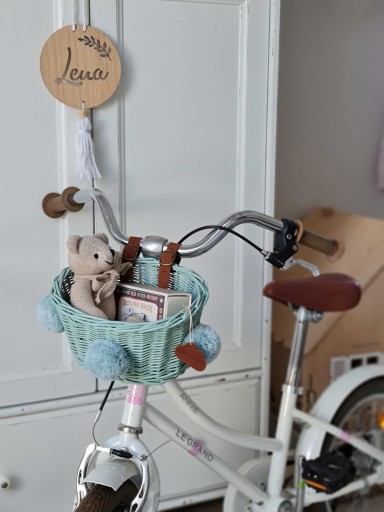 Красива плетена кошик для велосипеда з ремінцями з натуральної шкіри. Для найнеобхідніших скарбів маленького мандрівника.