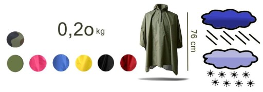 Накидка виготовлена з водонепроникної тканини (100% поліестер, подвійне просочення зсередини, водонепроникність в межах 3000 мм водяного стовпа) невеликої товщини / вага 0,2 кг /, завдяки чому займає мало місця і практично не обтяжує багаж. у поїздці чи поїздці. Він корисний і влітку, і взимку. Накидка настільки містка, що під неї можна помістити і рюкзак.