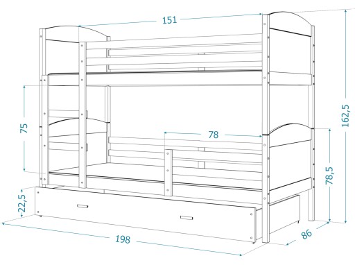 - Містка шухлядаВисувна на колесах. Можна використовувати як контейнер для постільної білизни або іграшок (шухляда є окремим елементом ліжка).