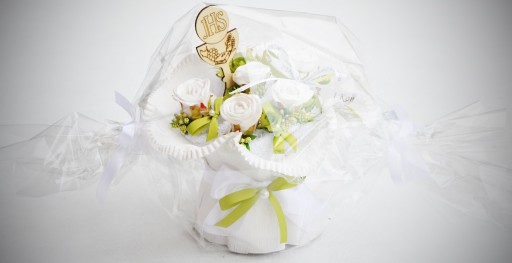 Ніжний біло-зелений набір із білим сувеніром на Перше Святе Причастя. Підходить як хлопчикам так і дівчаткам. Оформлення букета та скриньки з високоякісних флористичних аксесуарів.