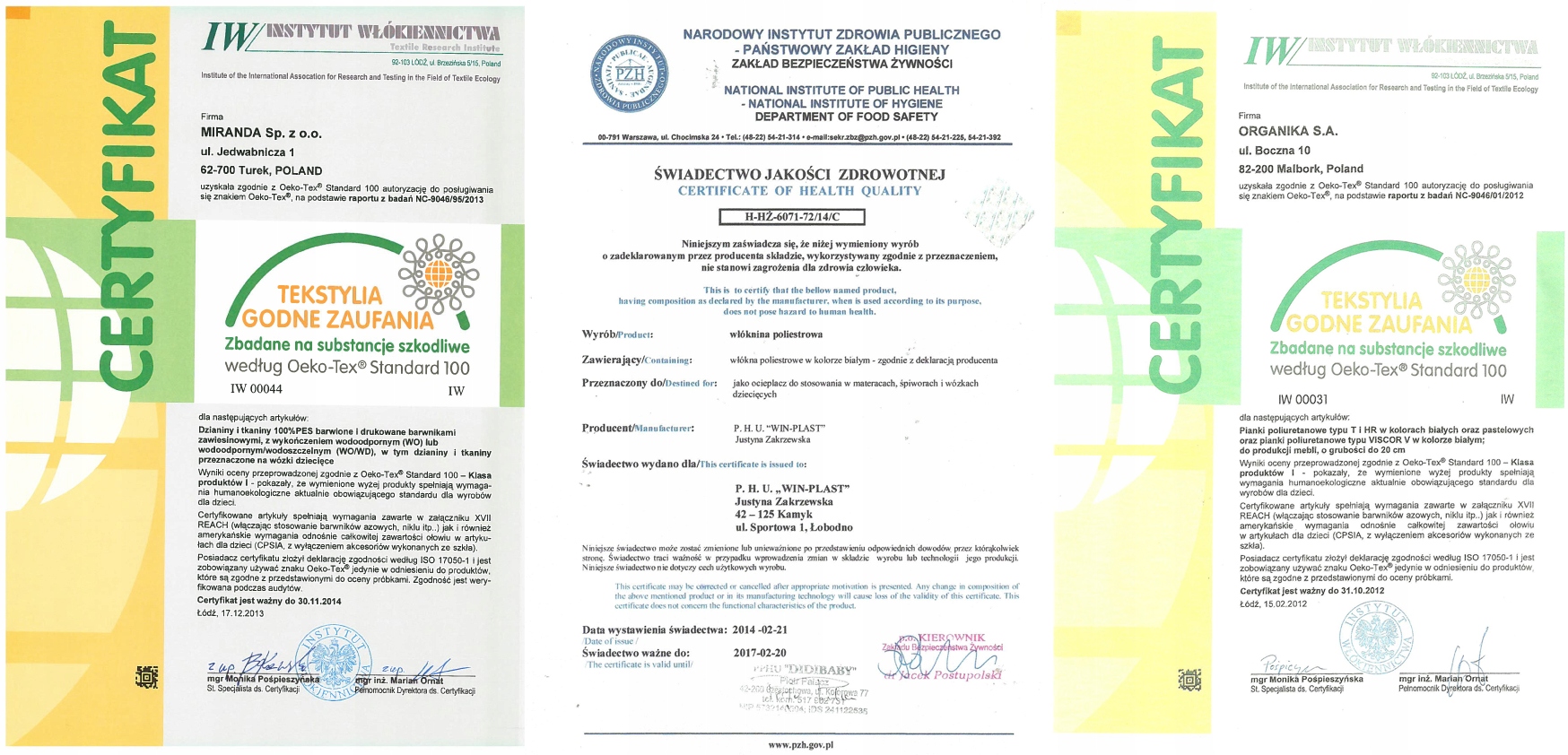 - Tkaniny do produkcji posiadają autoryzację Oko-Tex Standard 100