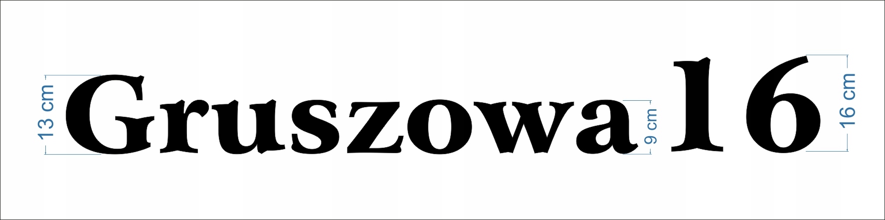 Litery ze styroduru mają 13cm wysokości (pierwsza duża litera w nazwie ulicy), a w przypadku kolejnych liter ok 9cm (wysokość kolejnych liter wychodzi z proporcji w zależności od wybranej czcionki). Wysokość cyfr w numerze domu to 16cm. Szerokość całości napisu (nazwa ulicy oraz numer domu) wychodzi z proporcji.