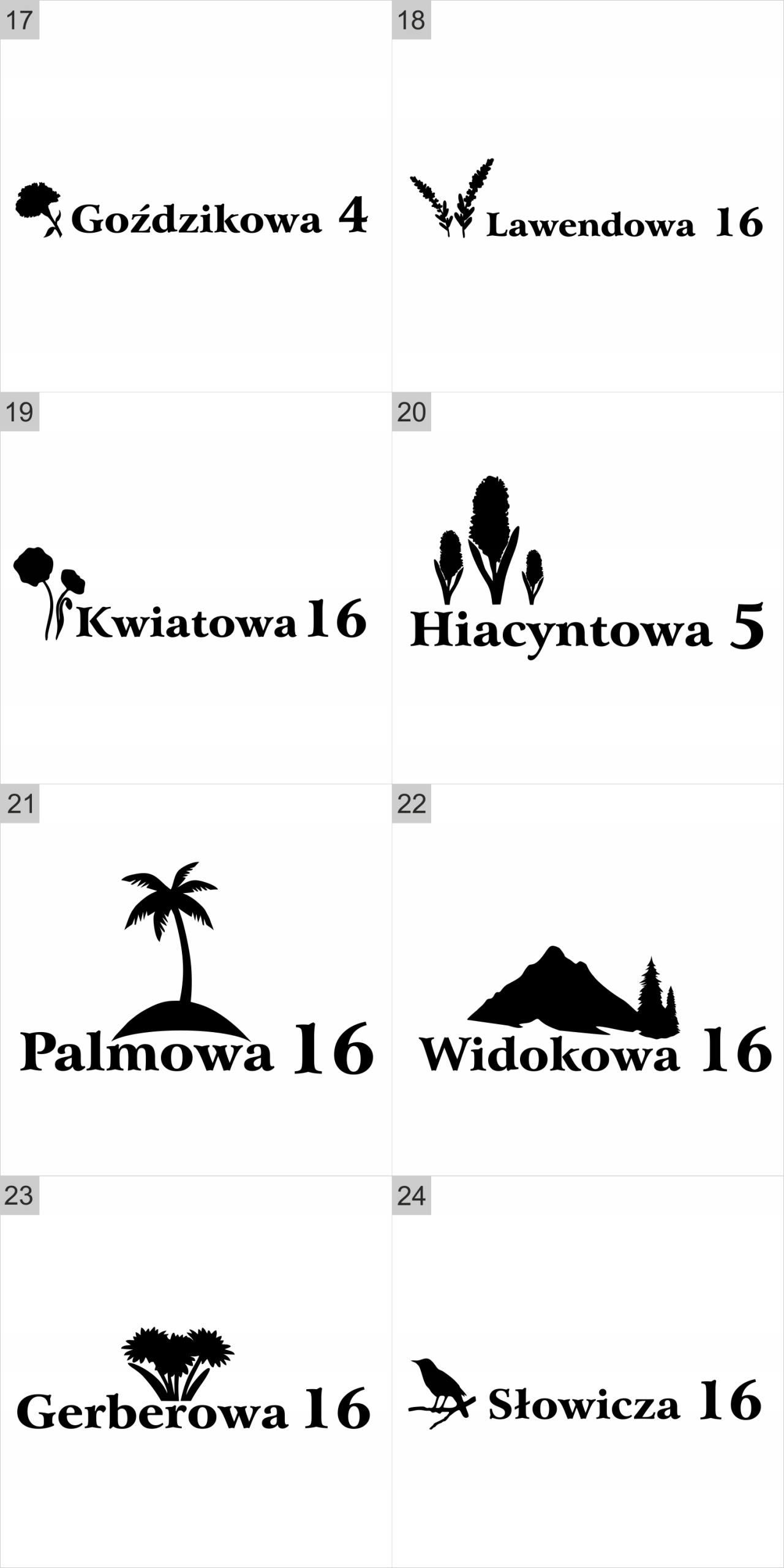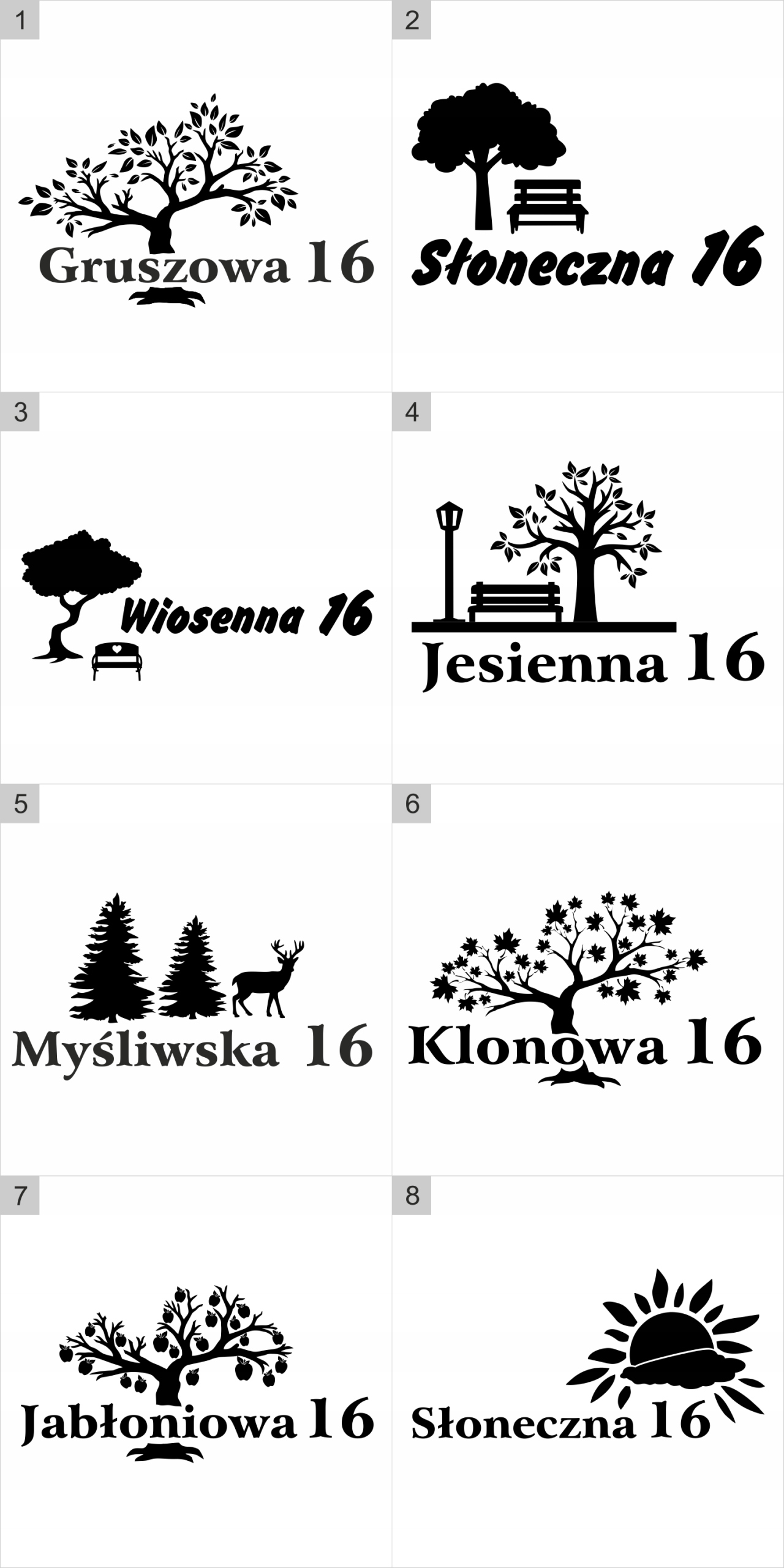 Po zakupie prosimy o informację dotyczącą wybranego wzoru oraz czcionki. W przypadku braku takiej informacji domyślnym wysyłanym zestawem jest wzór nr 1 oraz czcionka nr 1.