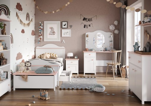 Молодіжна система меблів LUNA підкорить серця як маленьких, так і великих принцес. Колекція відрізняється незмінним стилем, різноманітністю і функціональністю, що дозволить ідеально облаштувати кімнату для дівчинки на кожному етапі дорослішання. Багатофункціональність меблів для дітей і підлітків дозволяє адаптувати інтер'єр під поточні потреби та вподобання. Класичні, білі форми з тонкими елементами пудрового рожевого кольору порадують своїх користувачів своїм універсальним стилем.