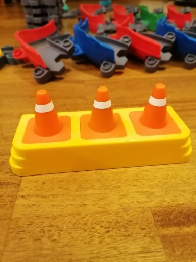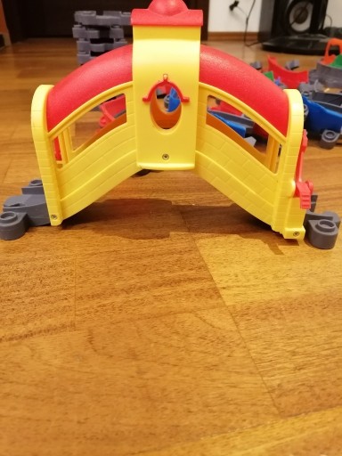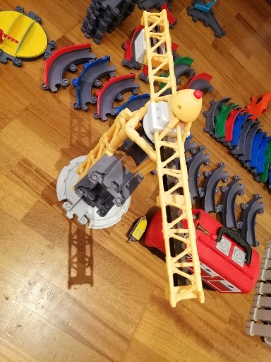 Продам два б/у набори блоків Stacyjkowo: Шторм і Пригода з краном (об'єднані в один набір): 16 високих прольотів, 9 низьких прольотів, вигини, перемикачі, мости, кран і ліфт.