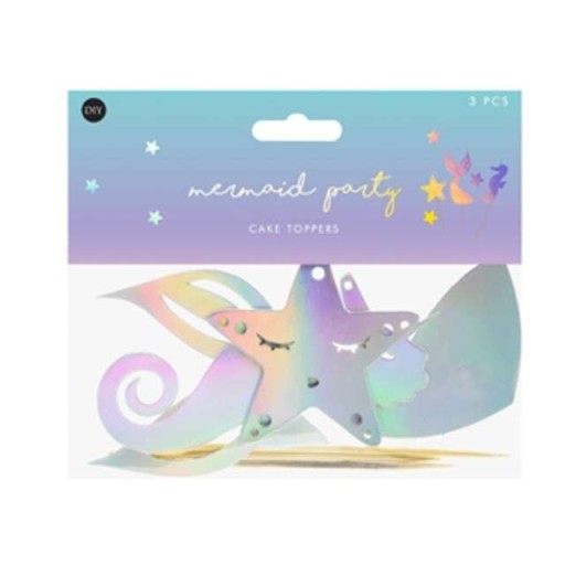 Сучасна, стильна прикраса з оригінальної колекції SYRENKI включає декоративні верхівки для тортів із міксом візерунків. Включає: морську зірку, хвіст русалки та водяного коня. Виріб із райдужного паперу з дерев’яними шпильками, який можна вклеювати в кекси, торти, фрукти чи інші закуски. Розміри топперів після складання від 18 до 24,5 см.