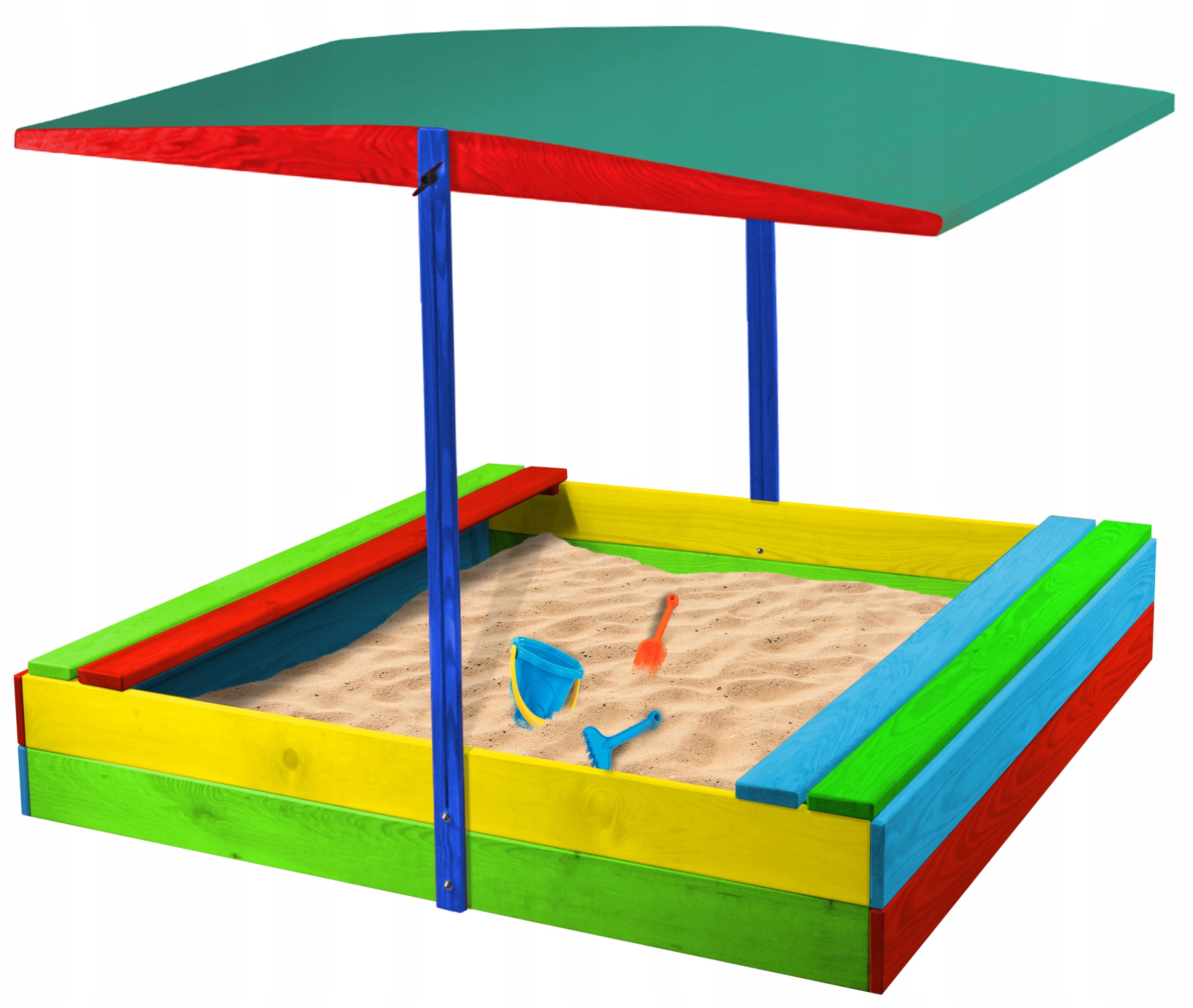 Piaskownica wykonana jest z suchego, czterostronnie struganego drewna iglastego, pozbawiona jest ostrych krawędzi. Pomalowana jest atestowaną farbą dekoracyjno - ochronną zgodną z normą bezpieczeństwa zabawek EN 71-3.