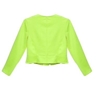 Wykonany jest z naciągającej się, miękkiej tkaniny zamszowej. Zapinany na srebrny zamek. Z boku doszyta ozdoba. Żakiet ładnie dopasowuje się do sylwetki ponieważ posiada taliowany modny krój. Pasuje do każdej sukienki, spódniczki, spodni.