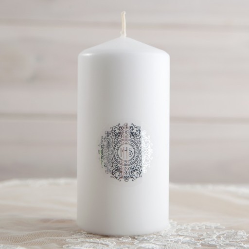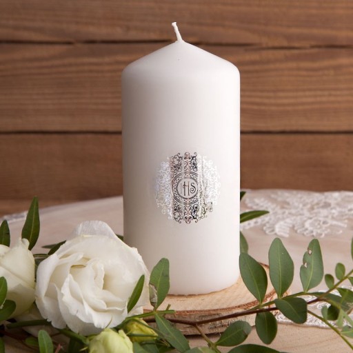 Елегантна причасна свічка зі срібною гостиєю. Гарне доповнення до вечірки Першого Причастя.
