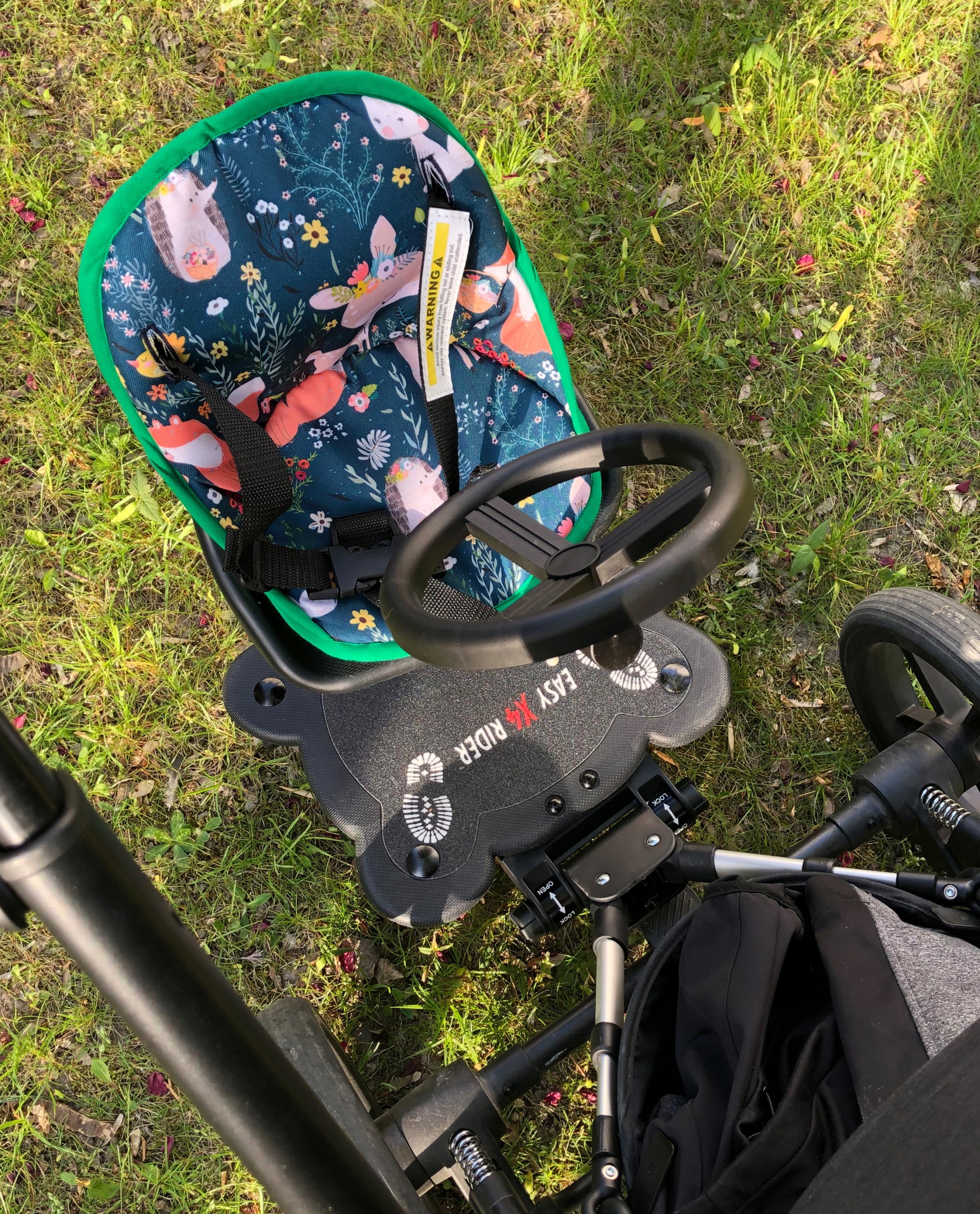 Easy X Rider v5 to dostawka 2w1 może być dostawką siedzącą, jak i stojącą. Dzięki uniwersalnemu teleskopowemu stelażowi i elastycznemu mocowaniu, pasuje niemal do wszystkich modeli wózków, zarówno parasolek jak i wózków 2w1 i 3w1. Easy X Rider montuje się na pionowych belkach idących od tylnych kół wózka. Składa się: z wygodnego siedziska, z 3-punktowymi pasami bezpieczeństwa, obrotowej kierownicy, kolorowej wodoodpornej mięciutkiej poduszki w wielu wzorach do wyboru, z antypoślizgowej platformy, świecących amortyzowanych kółek (2 tylne świecą), adapterów oraz paska, dzięki któremu możemy podnieść całość.
