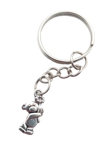Предмет пропозиції - невелика сумка з написом і брелок з підвіскою у вигляді ведмедика, що несе квіти.