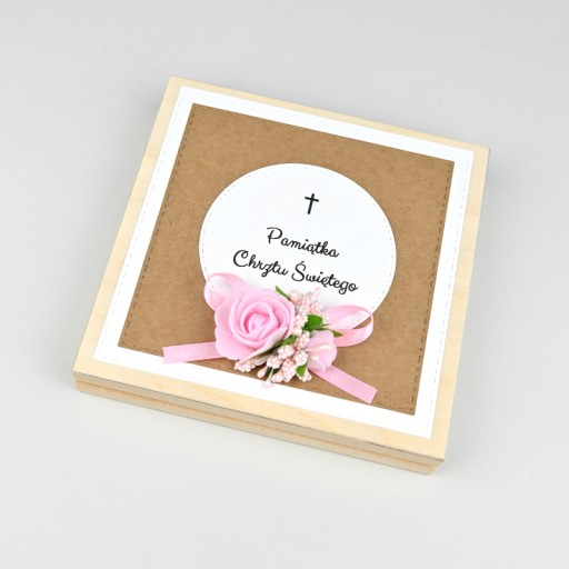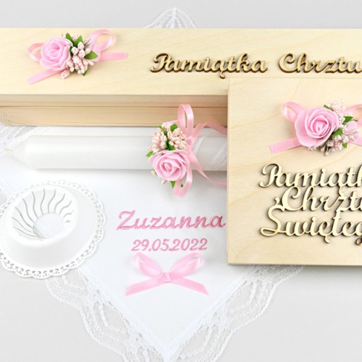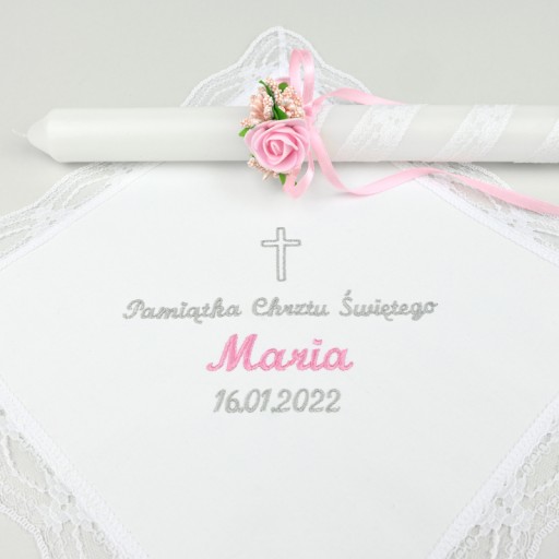 - має рожеву вишивку з ім'ям та датою хрещення, бантик такого ж кольору.