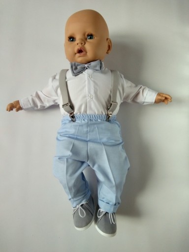 Сорочка боді з довгим рукавом білого кольору. Застібається на зручні кнопки. Краватка-метелик, зав'язаний на стрічці, додає стилю та елегантності. Штани з делікатного матеріалу, розріз зі складкою, елегантний манжет внизу штанини. На талії на резинці. Однак увагу привертає обробка комплекту - тобто привабливі підтяжки різних кольорів на вибір.