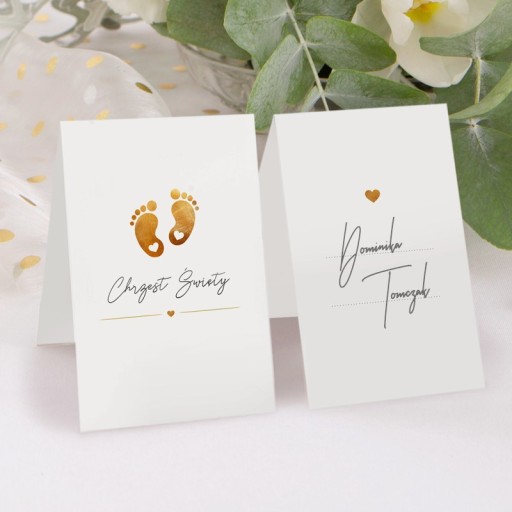 Красиві настільні листівки з мотивом золотих ніжок чудово прикрасять стіл для хрещення дитини. Завдяки тому, що віньєтки двосторонні, вони чудово виглядають на тарілках гостей. Візитки з написаними на них іменами дозволять гостям легко знайти своє місце за столом.