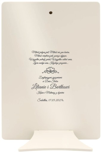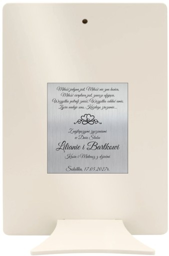 Присвята остаточно вигравірувана на пластині зі срібного ламінату. За бажанням ми можемо вигравірувати його на золотому гравіруючому ламінаті або безпосередньо на дереві. Особливо рекомендуємо вибрати гравіювання на дереві через її благородний і оригінальний зовнішній вигляд.