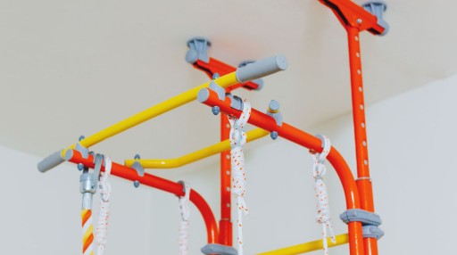 Абсолютна простота збірки розкладної драбини дозволяє в подальшому легко перенести її в інше місце. Система кріплення розпірок дозволяє уникнути свердління отворів у стінах і дозволяє встановлювати драбину в приміщеннях висотою від 227 см до навіть 325 см після подовження драбини додатковими 2 ступенями. Розпірний варіант підлаштовується під висоту квартири і дозволяє максимально використовувати весь простір в кімнаті, який ми відвели під цей спортивний інвентар. Система монтажу розпірок безпечна і сертифікована для використання як дітьми, так і дорослими - полягає в телескопічному висуненні металевих вставок зі стійок драбини до рівня стелі, а після фіксації вставок - відкручування гвинта, що розширює гімнастичний набір. між площинами, наскільки це можливо. Драбина торкається стелі чотирма елементами діаметром 8 см.